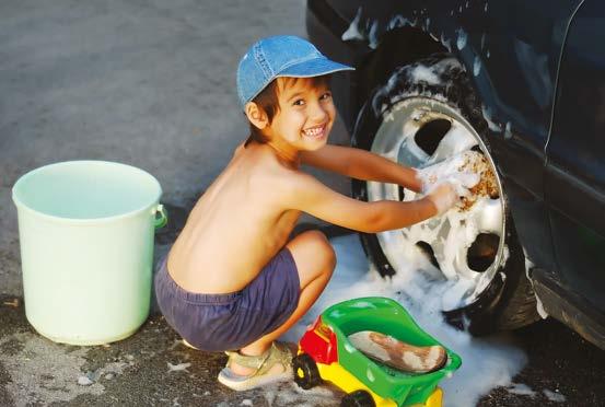 Los sábados, yo lavo el coche de mis papás. ¡Me gusta jugar con el agua! Después, el coche está muy limpio y yo estoy muy contento.