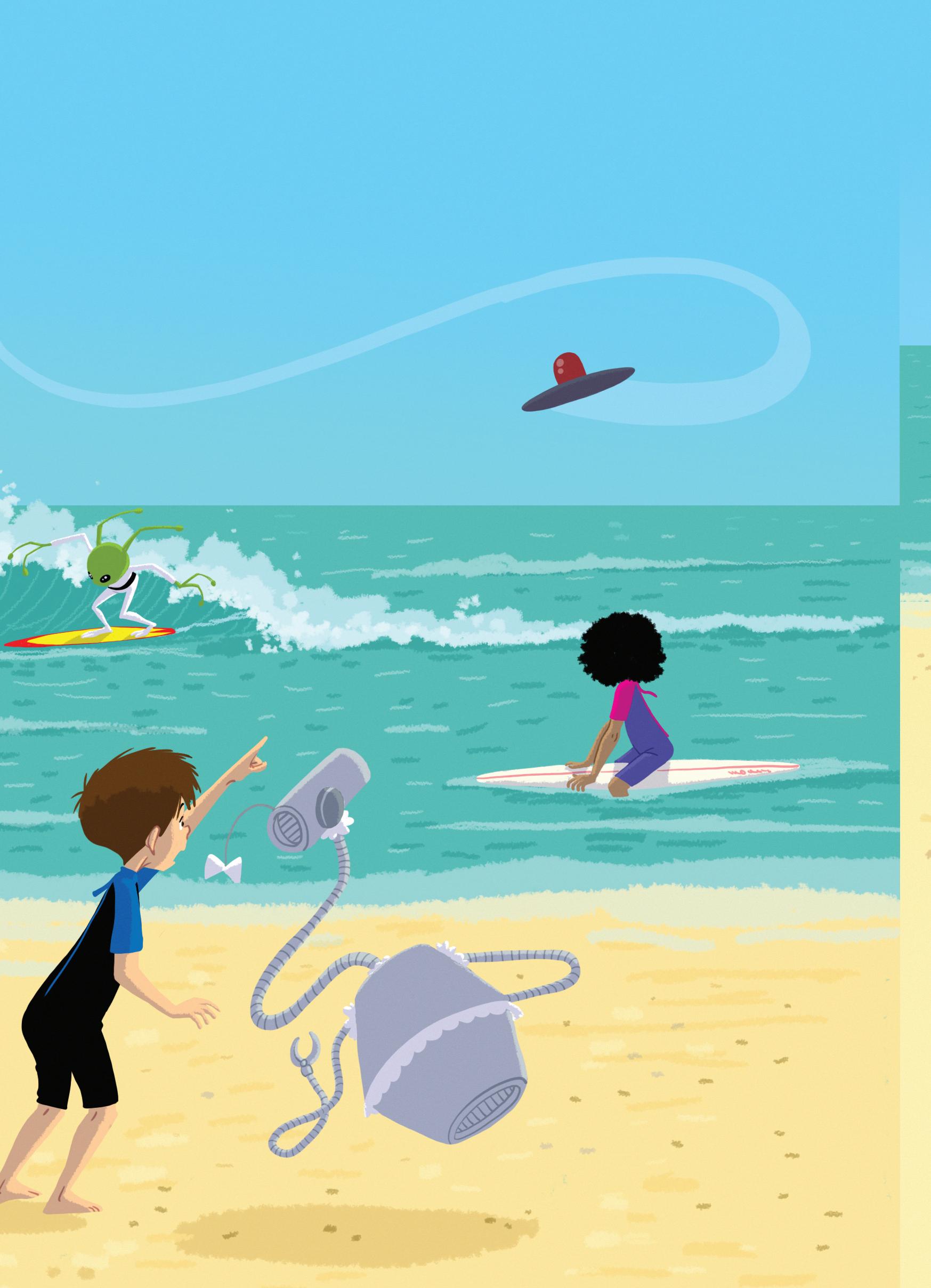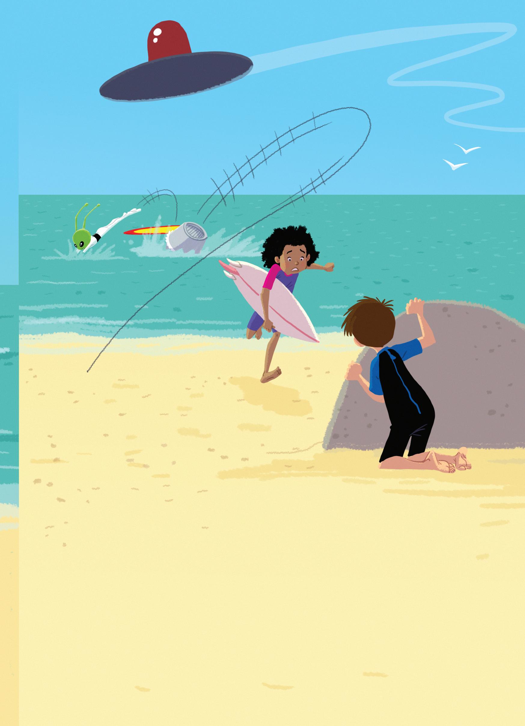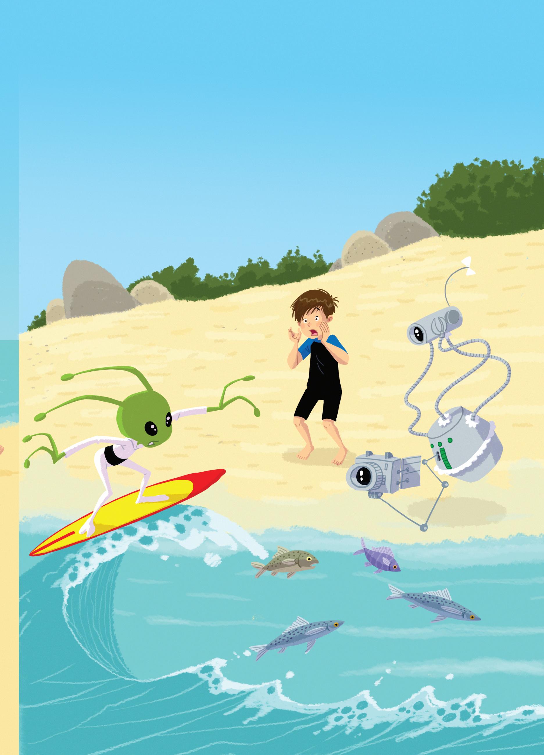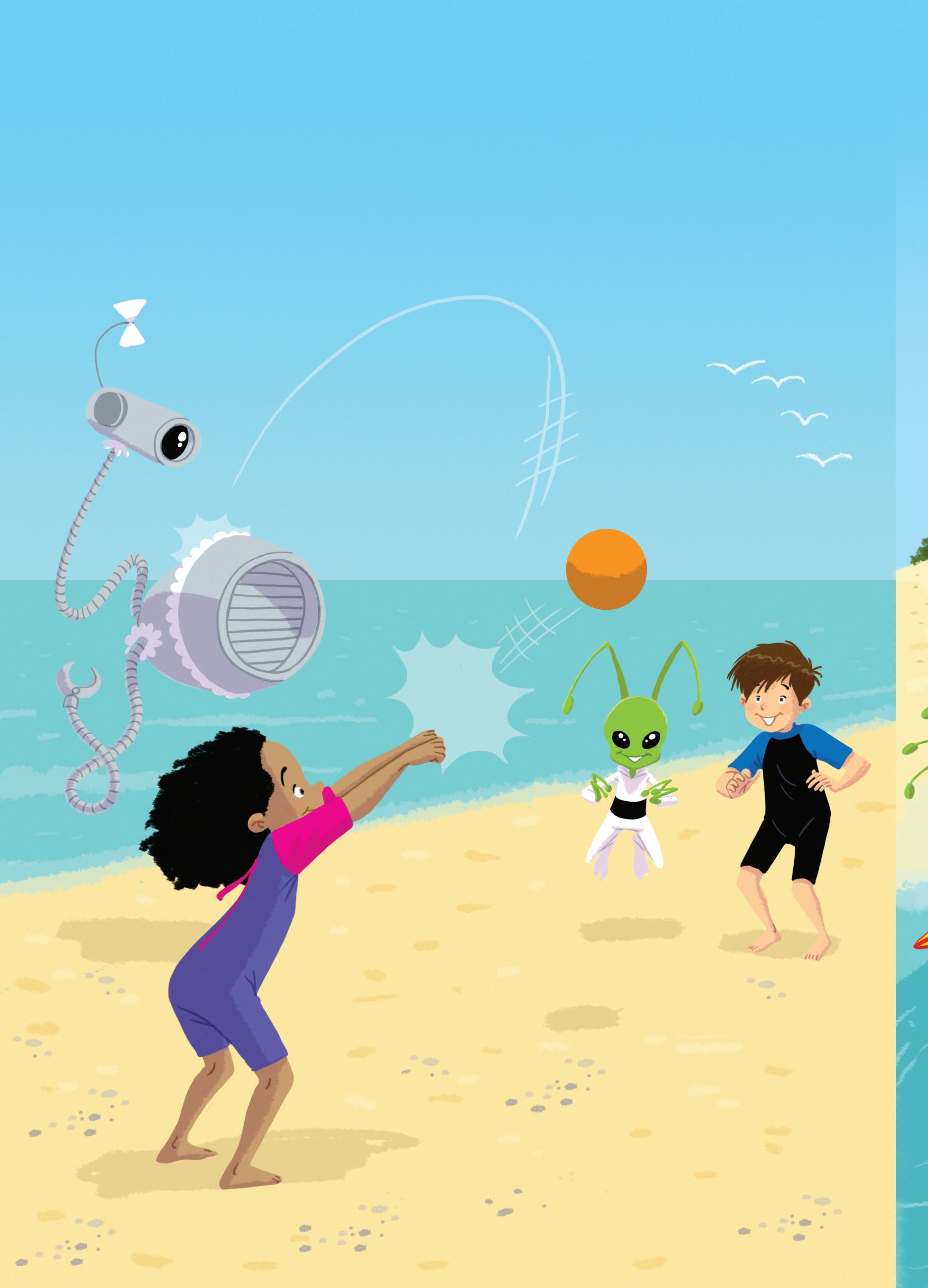 PB3 è un extraterrestre e Milla è la sua amica robot. Vengono dal pianeta P3 e amano visitare la Terra. Oggi sono al mare con i loro amici Davide e Susanna.