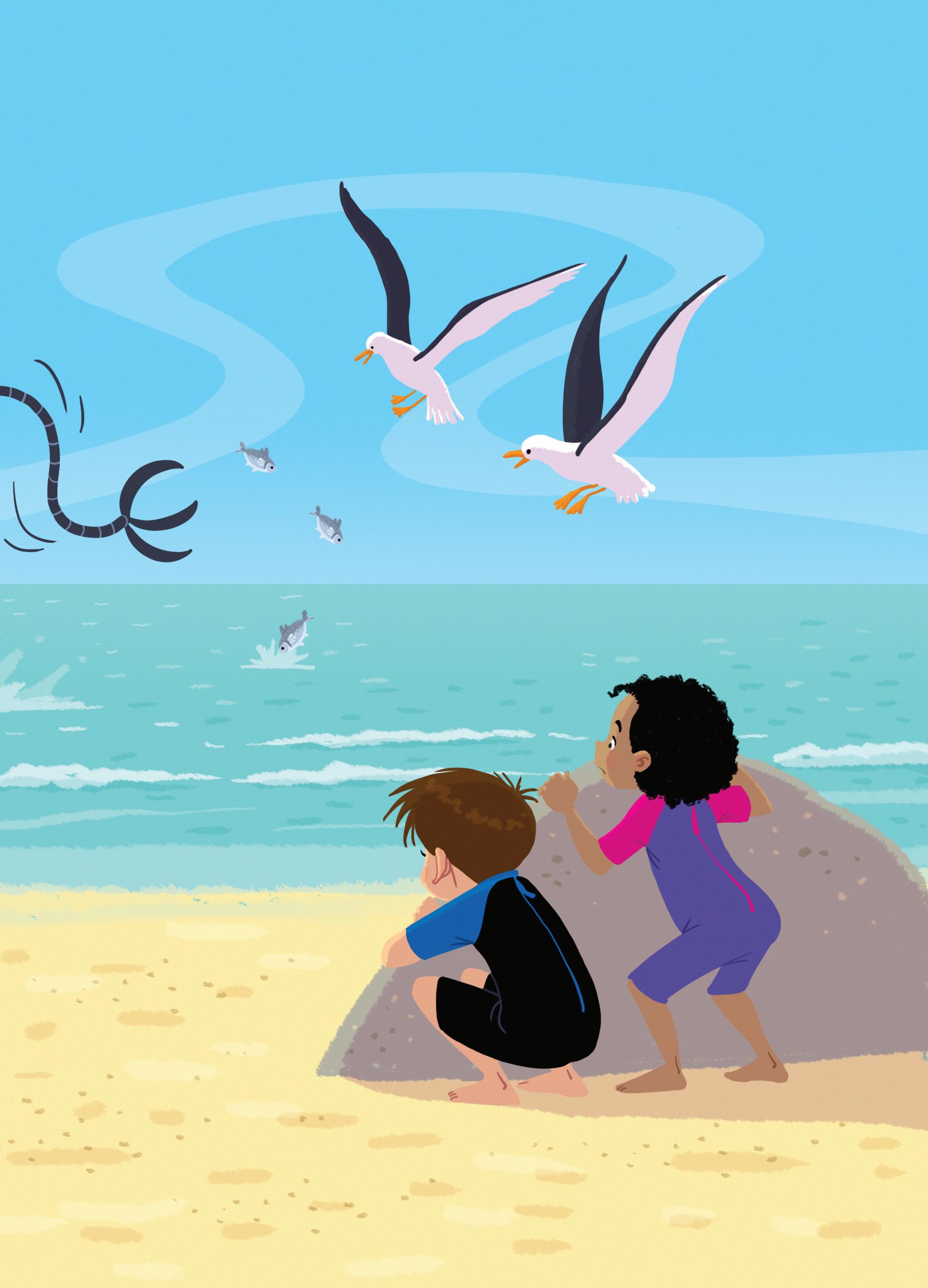 Davide e Susanna hanno paura e si nascondono dietro una roccia. PB3 e Milla si tuffano in mare!