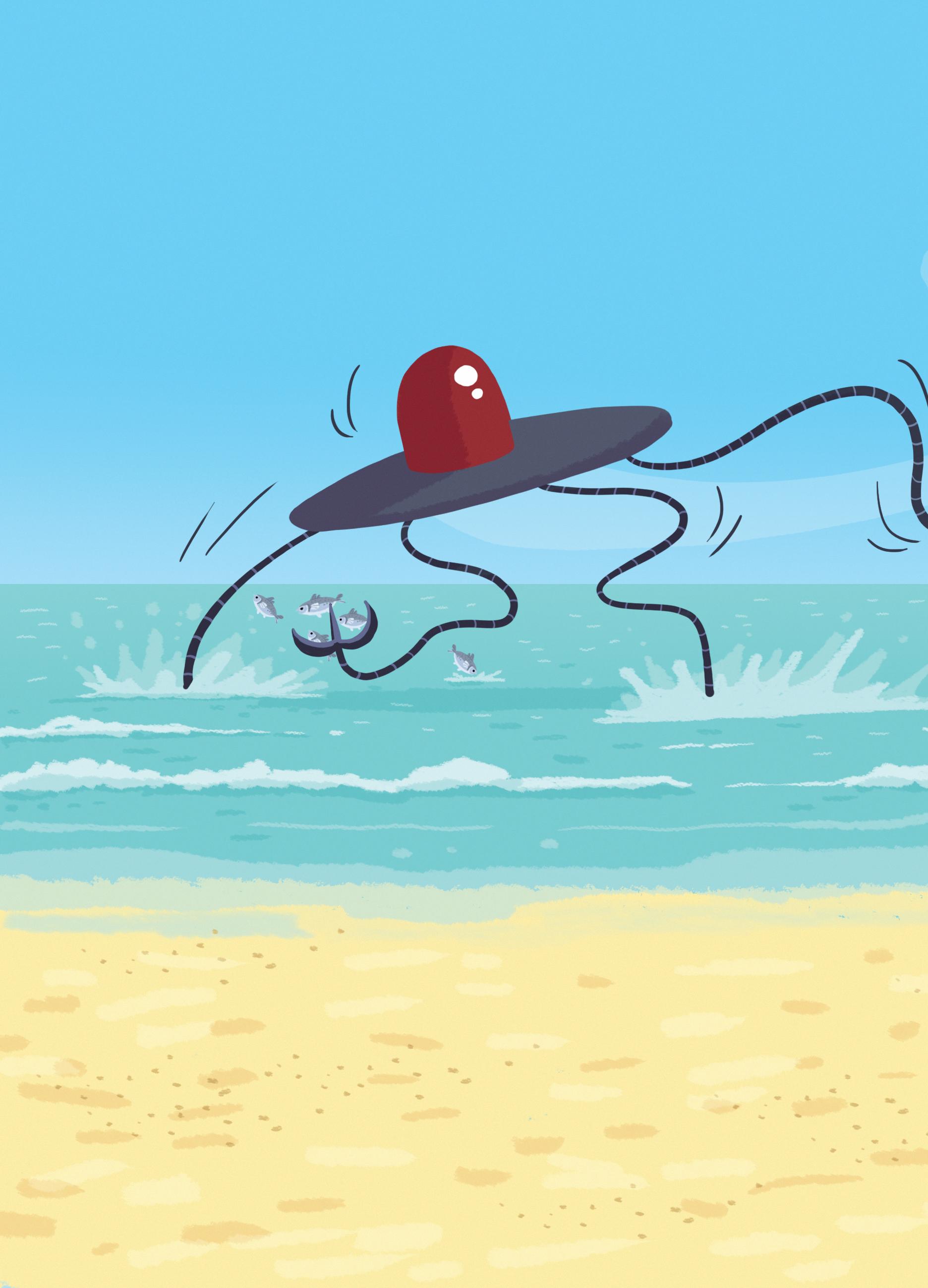 Ma cosa fa? Vuole catturare i pesci e i gabbiani? No! Con le sue lunghe braccia nere cerca PB3 e Milla nel mare!