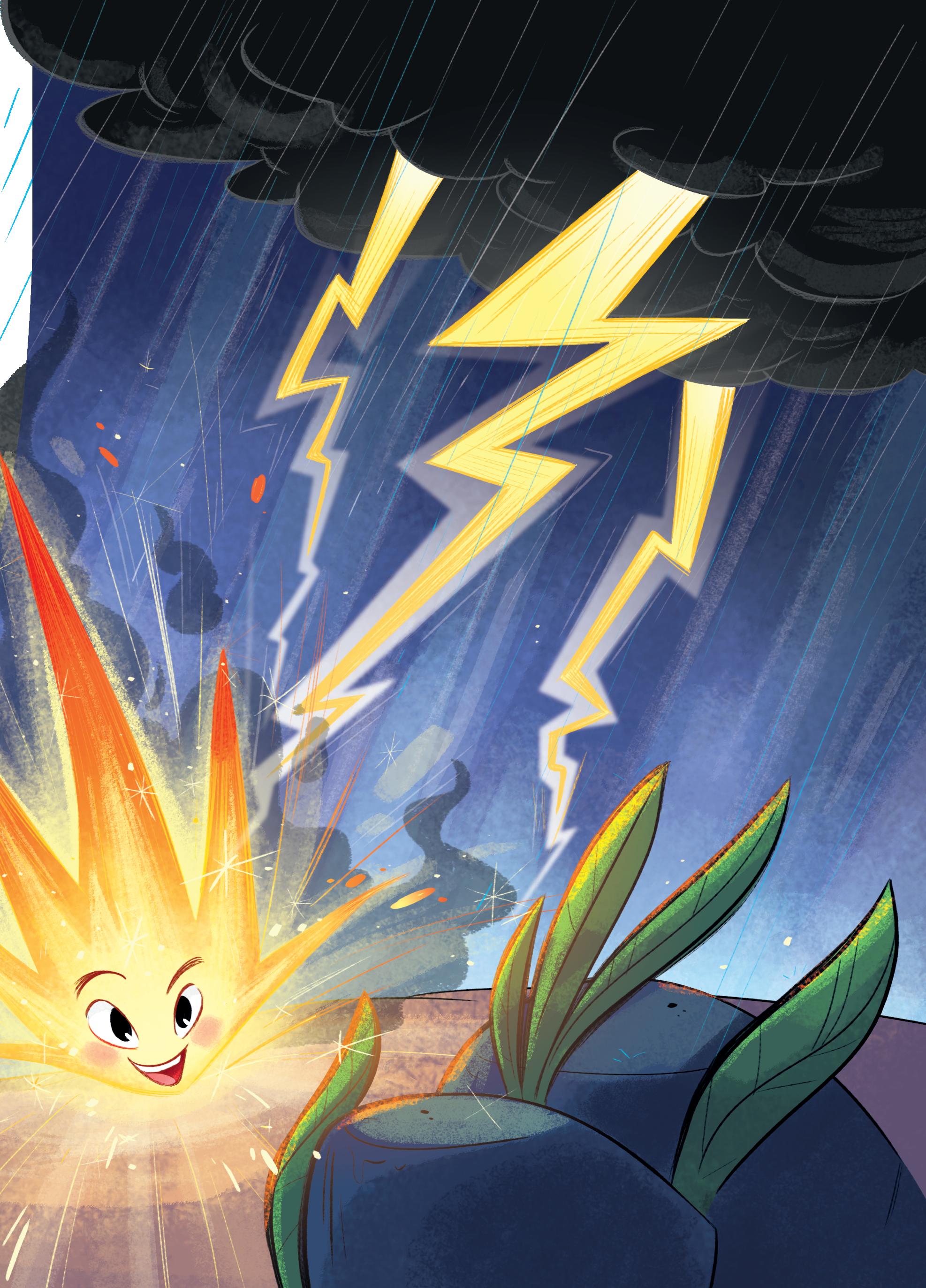 Scintilla sfoggiava al meglio le proprie capacità, già si immaginava una fiamma incandescente che cresceva, ma mentre gongolava, troppo orgogliosa del suo primo, fortunato tentativo, una raffica di gocce di pioggia colpì le foglie. Il fumo svanì, il calore si dissolse e… nulla di fatto. Tentativo fallito.