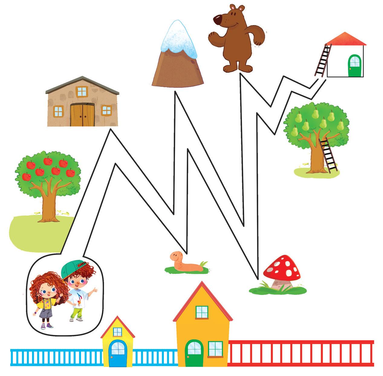 • L’insegnante introduce l’attività e racconta. Rock e Roll in una bella giornata di sole vogliono raggiungere un rifugio in montagna, ma non sanno la strada. Vogliamo aiutarli? Indichiamo loro la strada, prima con il dito, poi lasciando il segno con la matita.