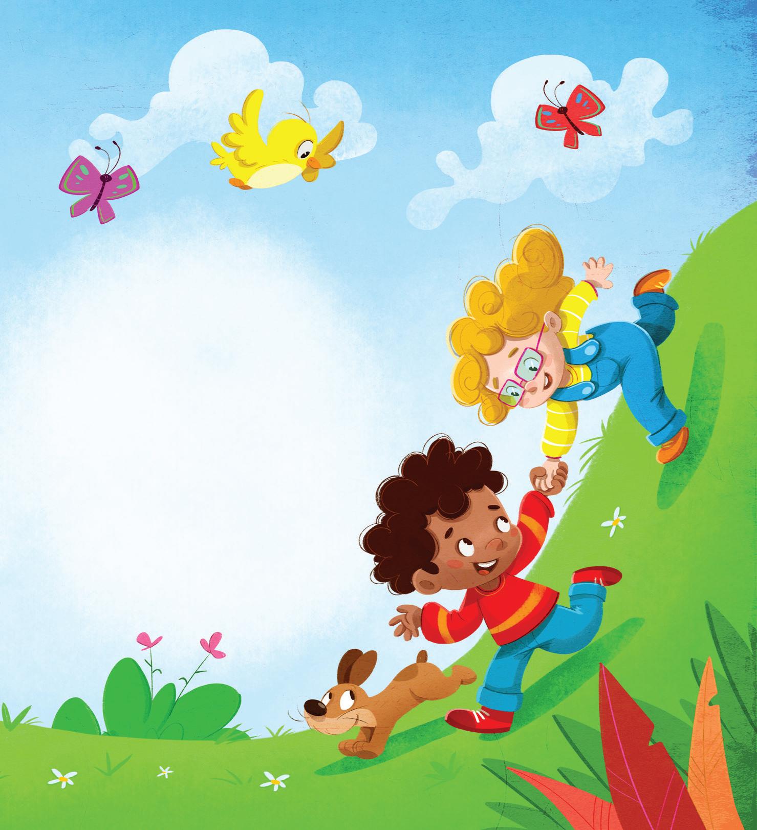 La nonna e i due bambini si divertono su tanti scivoli invisibili. Vogliamo disegnarli e farli comparire?