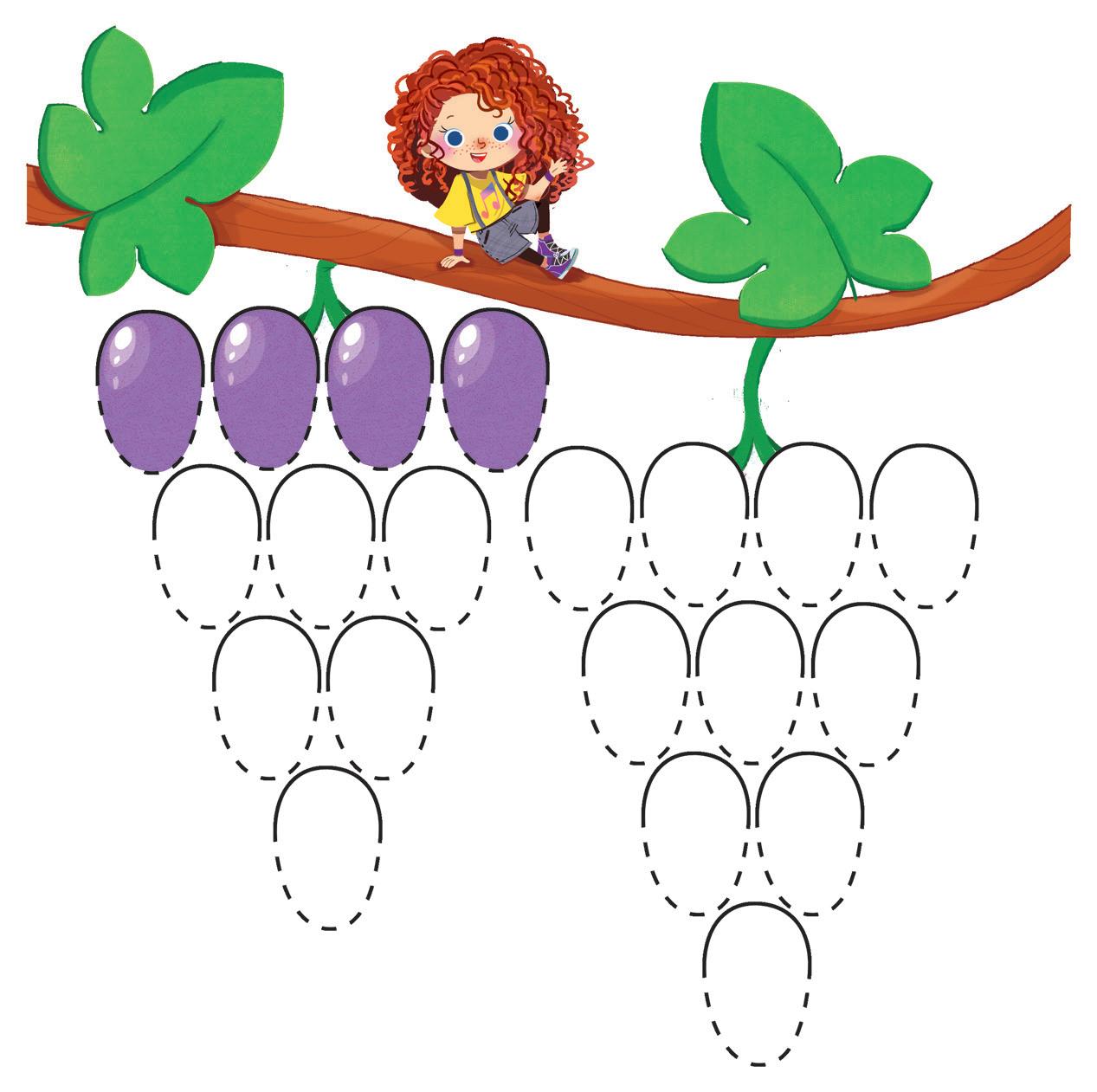 • L’insegnante introduce l’attività e racconta. Dove sono i bei grappoli d’uva che erano sulla vite? Oh no, sono spariti! Se li disegniamo, i due gemelli li raccoglieranno per gustarli con la nonna.