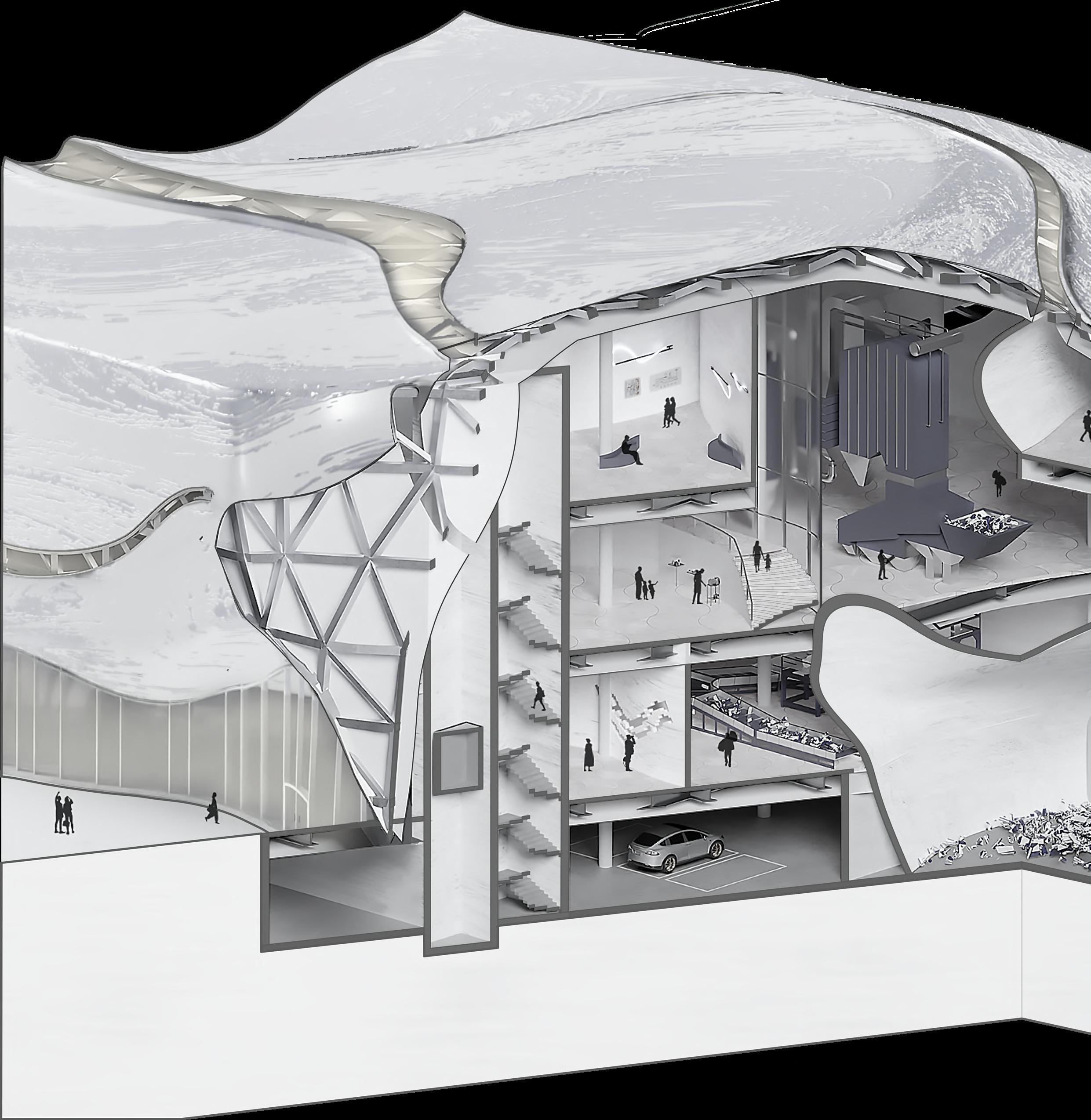The ‘NIMBY’ phenomenon is a major obstacle to solving the climate crisis. If the waste treatment process is transparently displayed and the public learn it through direct observation, people can trust waste treatment technologies and facilities and increase their awareness and participation in environmental protection. In addition, cultural facilities using waste plastics can reduce psychological discomfort about wastes. Therefore, this project proposes a ‘Museum of Plastic Waste’ where WTE facility and interactive media art museum coexist. In the museum, plastic wastes are converted into electrical energy, and this electricity is used in media art exhibitions. This lead of plastic waste to art can be said to be a series of processes in which plastics are deformed. This design focused on the ‘deformation’ of this plastic.