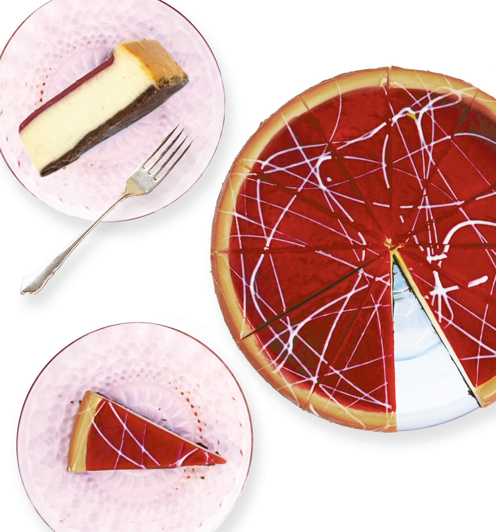 Smooth white chocolate cheesecake topped with a mirror of raspberry gelée and a white chocolate drizzle, baked on an all-butter chocolate shortbread cookie crust.