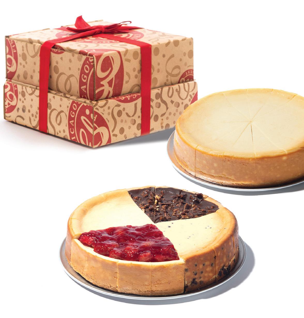 One 7” French Silk Cheesecake, one 8” Original Plain Cheesecake, and one 9” Strawberry-topped Cheesecake, arrive stacked in our custom gold and red gift boxes tied with a red ribbon, ready for gift giving. $110 Serves 40