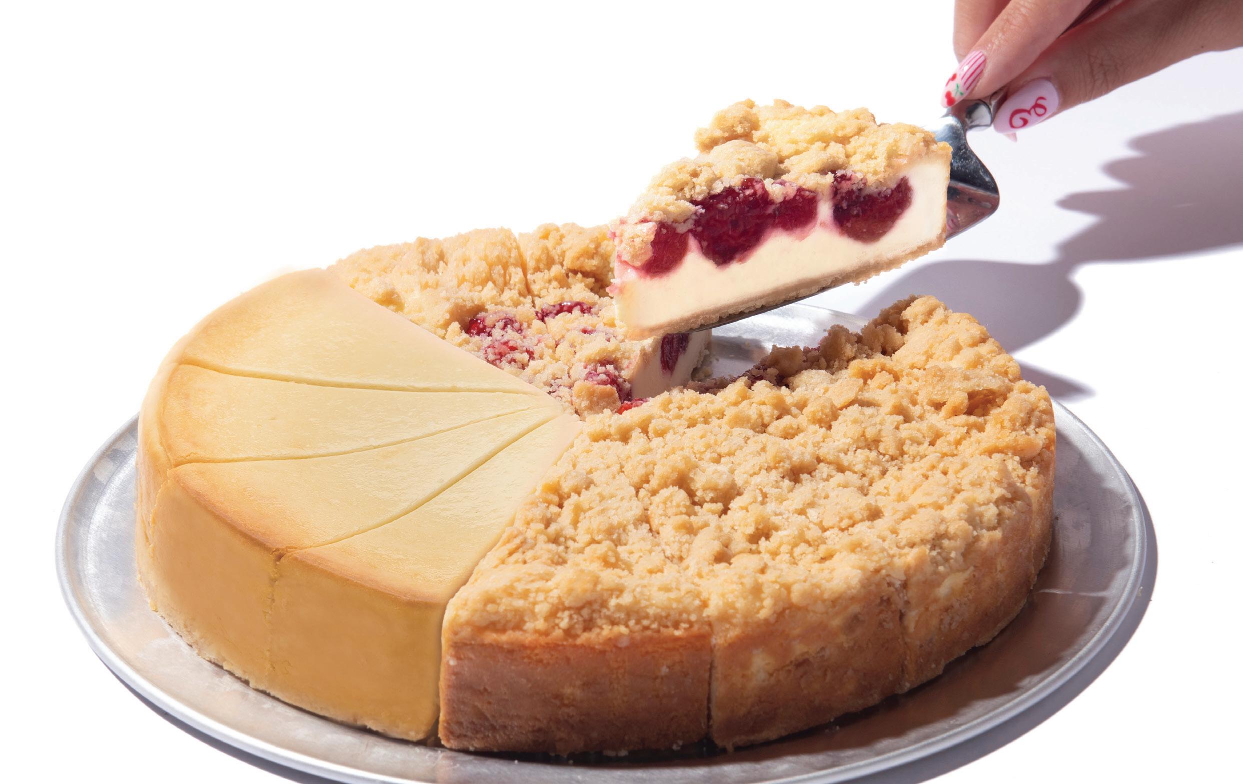 Something for everyone this holiday season... Four festive flavors, all in one cake! 4 slices each of Cranberry Crumble, Cinnamon Roll, Hot Chocolate, and Original Plain Cheesecake. $76 9”, 3 lb. 8 oz. Pre-cut, Serves 16