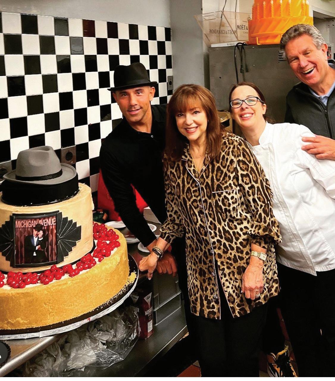 In the kitchen with Billy Dec, getting ready to cut and serve a giant cheesecake adorned with Billy's signature hat, created to celebrate the expansion of the Underground Cocktail Club and his Michigan Avenue Magazine cover.