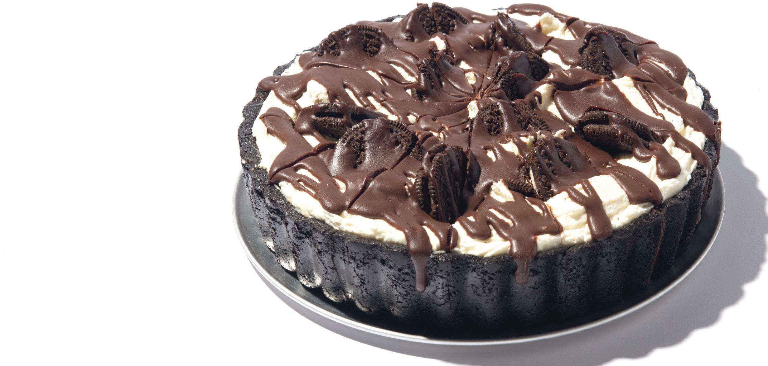 Eli’s Original Plain Cheesecake with chunks of chocolate sandwich cookies, topped with whipped cream, a rich chocolate drizzle and more cookies, baked on a chocolate cookie crust. $65 9”, 4 lb. 2 oz. Pre-cut, Serves 14