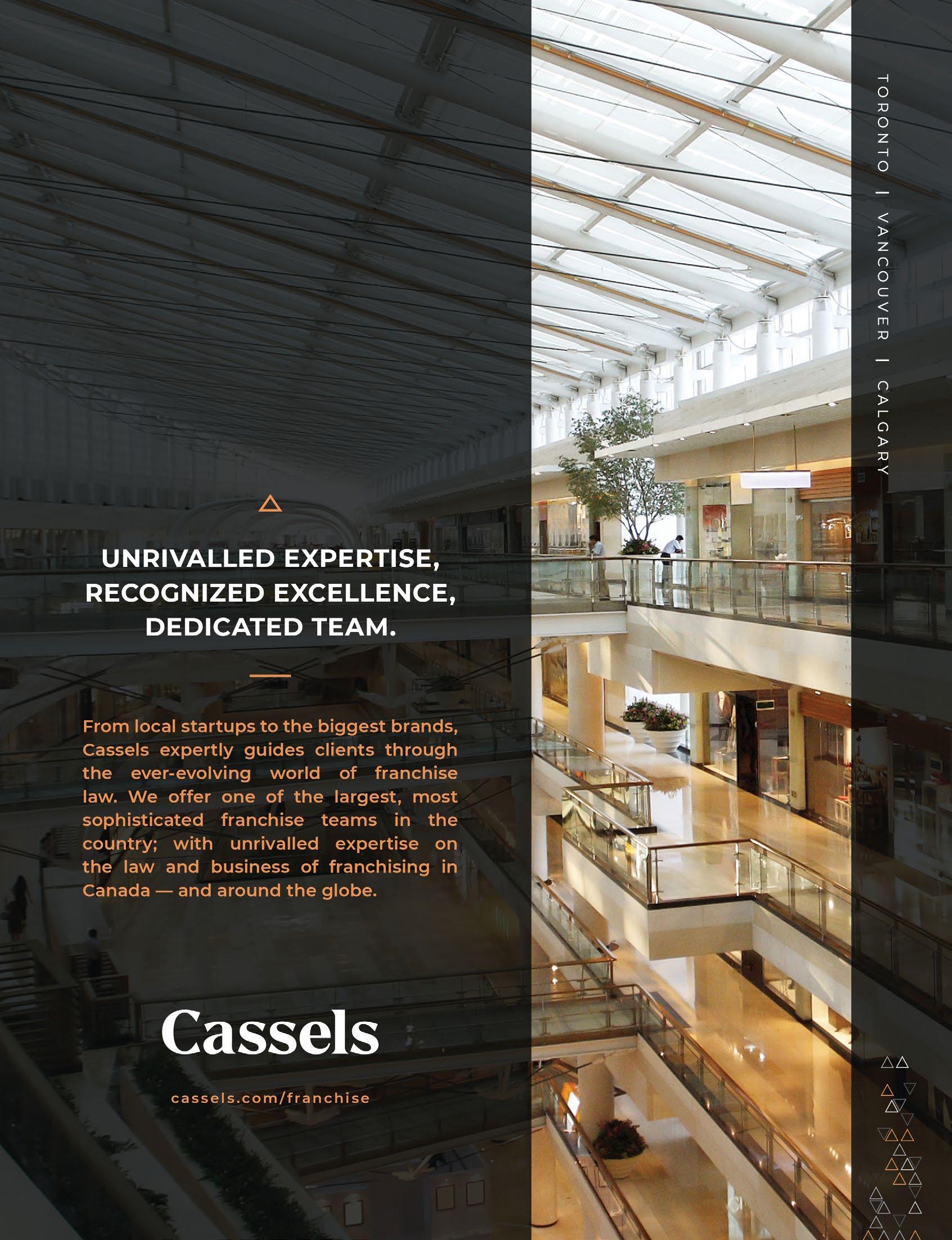 Cassels Brock & Blackwell LLP is a Canadian law firm focused on serving the transaction, advocacy, and advisory needs of the country’s most dynamic business sectors. Cassels offers one of Canada’s largest and most sophisticated national franchise law groups, with over 25 franchise law team members proving expert advice on expansion to, and operating in, Canada.