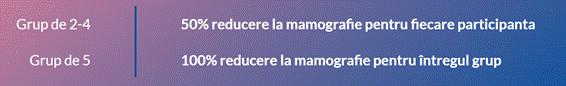 Puteți beneficia de mamografii gratuite dacă vă programați în grup de 5 persoane sau puteți beneficia de reducere de 50% pentru grupuri de 2-4 persoane.