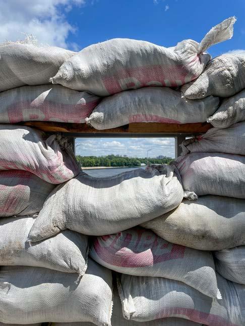 The left bank of Kyiv, seen through the sandbags of war, An island in the center of the Dnipro River, with parks and beaches for recreation.