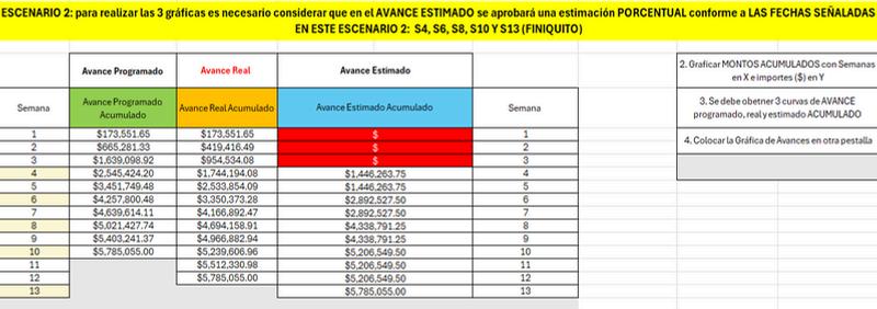 Escenario 1: Estimaciones semanales con la amortización del anticipo distribuida durante las 10 semanas, sin considerar un pago final adicional del 10%.