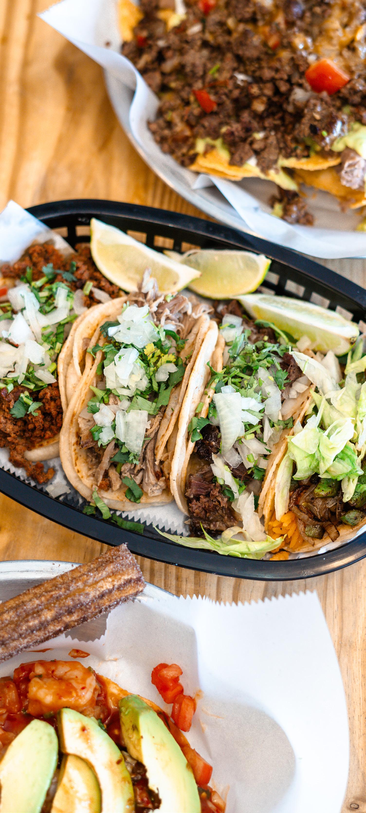 SUPER NACHOS WITH GROUND BEEF, SPICY CHORIZO TACO, CARNITAS TACO, BARBACOA TACO, AND VEGGIE TACO, SPICY SHRIMP TOSTADA AND CHURRO ALL FROM PAPI’S TACOS.