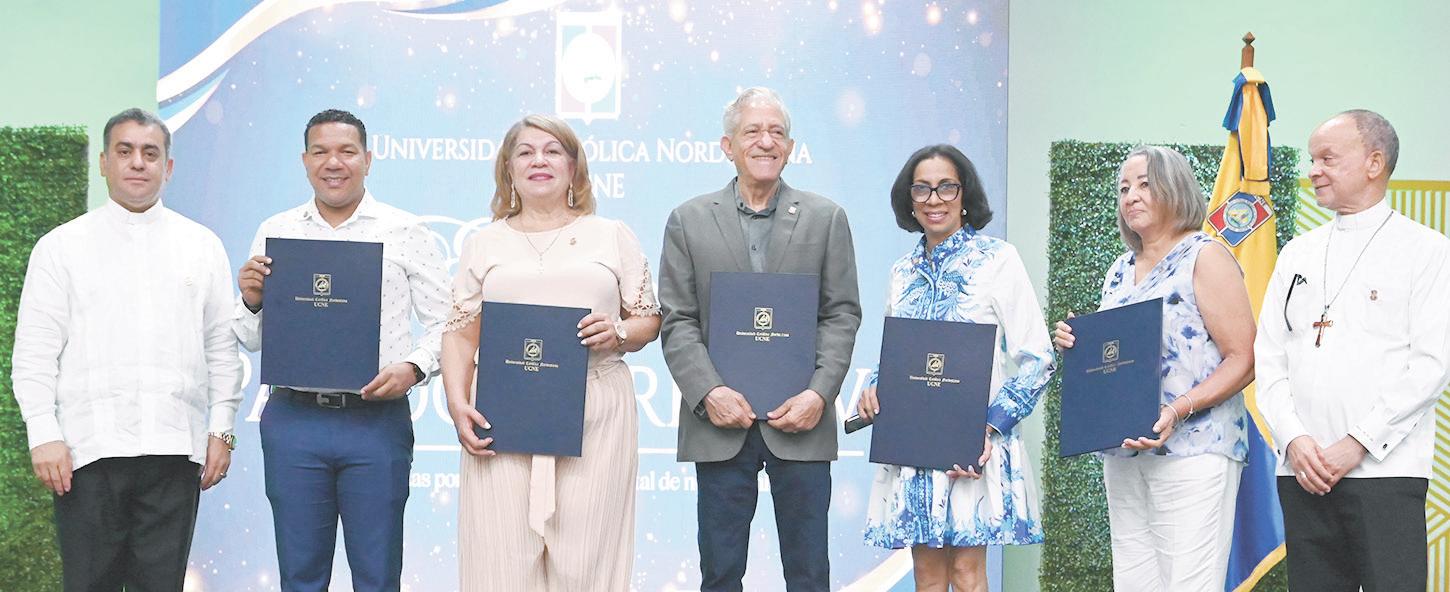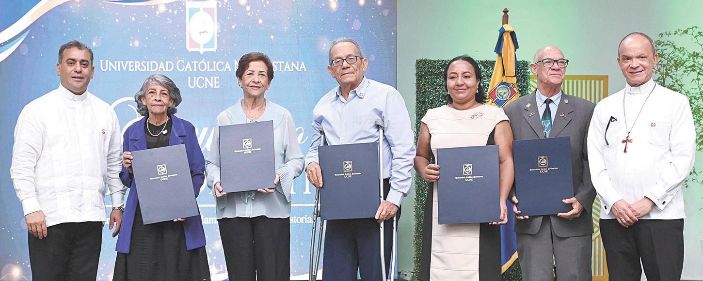 La Universidad Católica Nordestana (UCNE) rindió homenaje a profesores, ex funcionari os y ejecutivos que cubrieron las etapas más críticas en el desarrollo de esta Casa de Altos Estudios. Entre los homenajeados están el maestro Pedro Félix Jiménez Bencosme y la Dra. Yanny Almánzar de Jiménez. Sus amigos de EL JAYA les felicitan