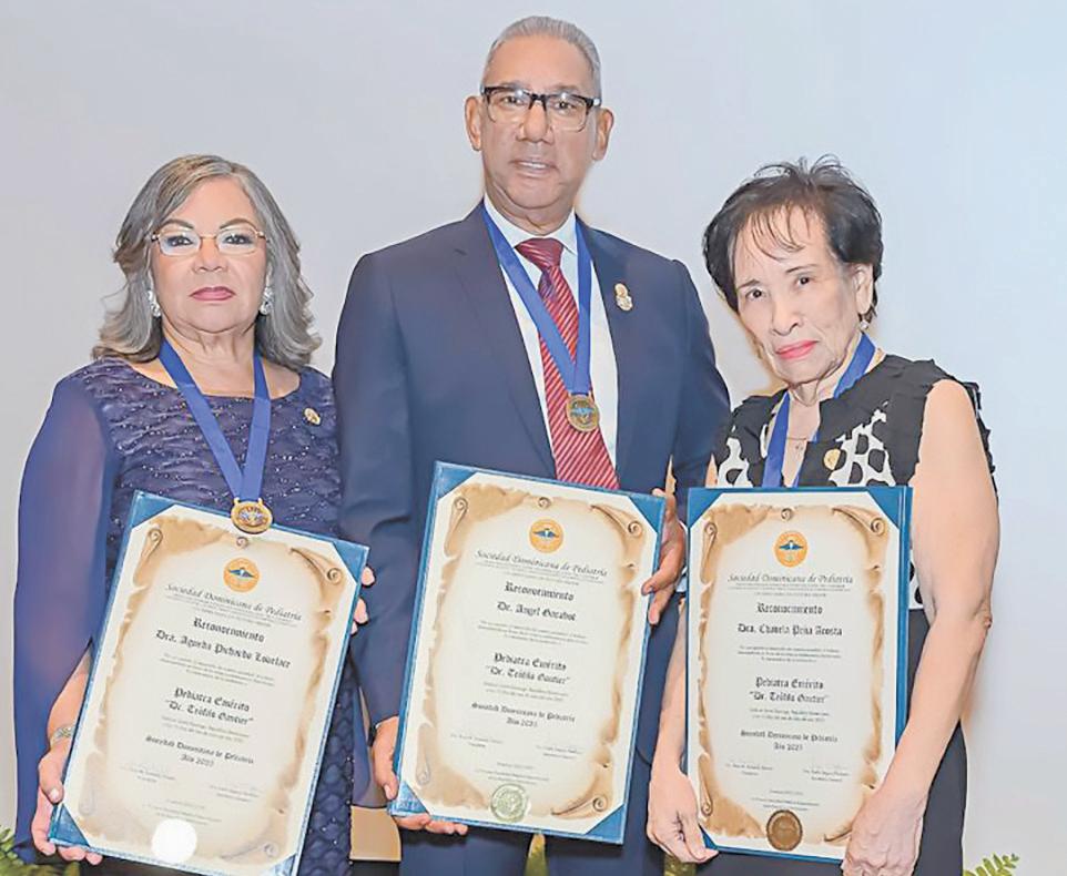 ❏ Los doctores Agueda Pichardo, Ángel Garabot y Chavela Peña Acosta exhiben los pergaminos y las medallas que los acreditan como “Pediatras Eméritos 2025”, distinción otorgada por la Sociedad Dominicana de Pediatría durante la ceremonia “Exaltación del Pediatra Emérito Dr. Teófilo Gautier”, celebrada en Santo Domingo.