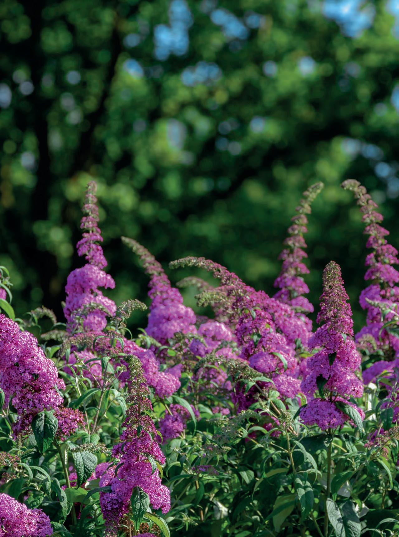 • B. davidii ‘Miss Ruby’, a compact shrub with striking magenta flower spikes, highly attractive to butterflies.