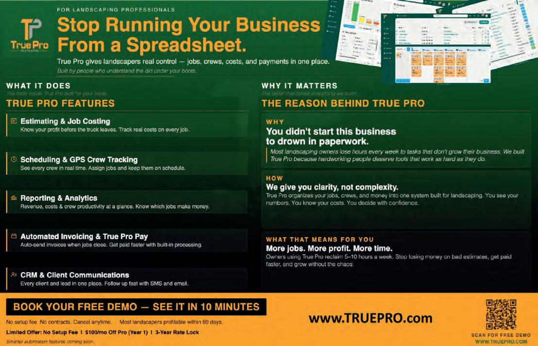 Pro Landscaper USA is published 12 times per year by Eljays44 Ltd. The 2026 subscription price is $160. Subscription records are maintained at Eljays44 Ltd, Village Workspaces, 11845 W Olympic Blvd, Los Angeles, CA, 90064. Articles and information containe d in this publication are the copyright of Eljays44 Ltd and may not be reproduced in any form without the written permission of the publishers. The publishers cannot accept responsibility for loss of, or damage to, uncommissioned photographs or m anuscripts.