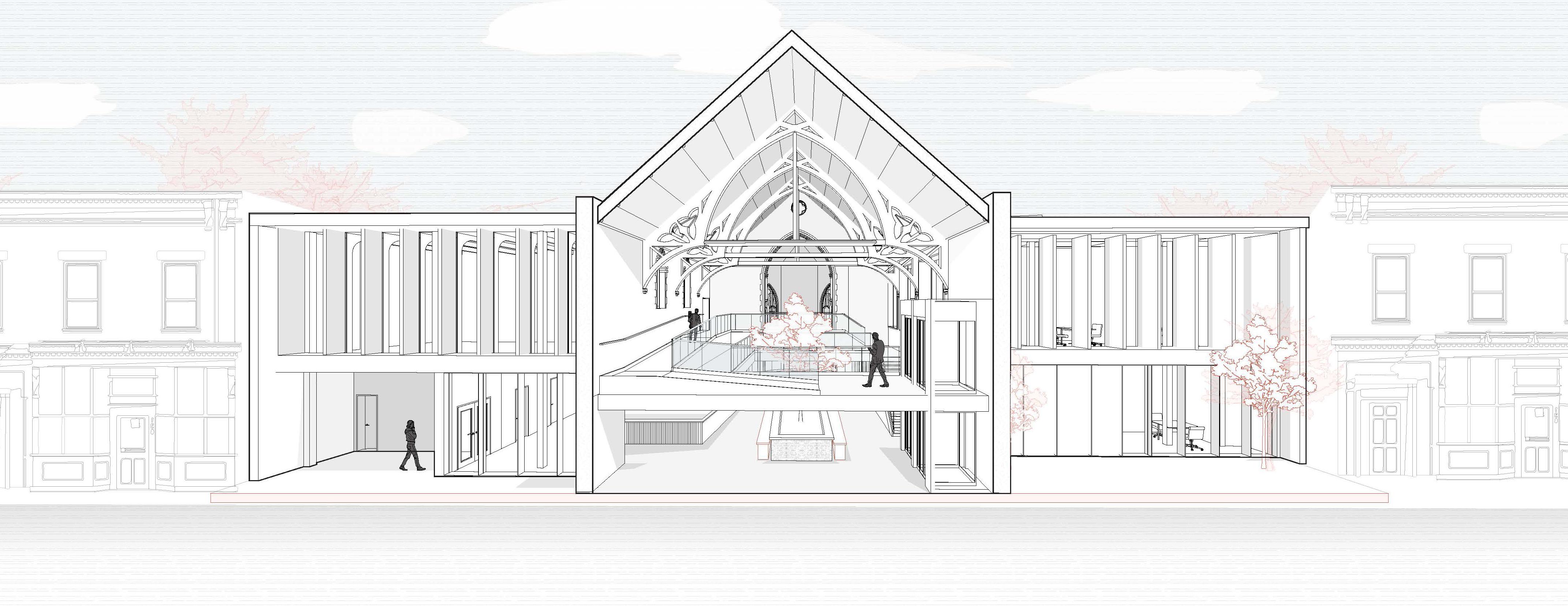 The extension features a curved design to contrast, but follow the existing angular shape of the church. Inspiring movement around the building, using the existing architecture as a pathway across the entire interior.