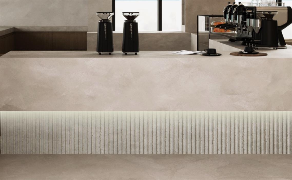 The café counter has been designed in accordance with the client’s equipment requirements. It features a Corian worktop with a mitred edge and concealed LED lighting, which washes down onto glossy mosaic tiles.