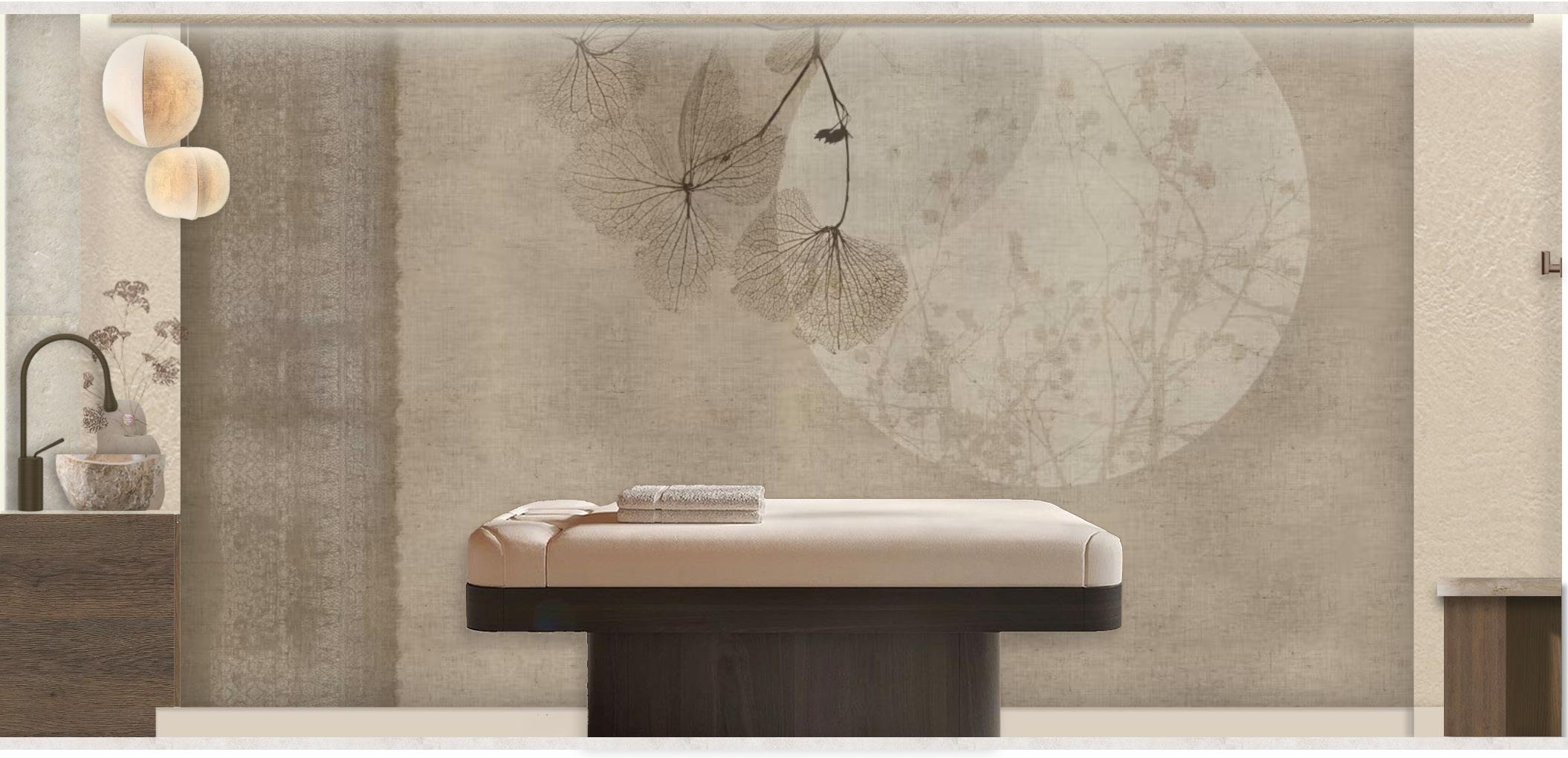The design was inspired by Ayurveda, a holistic approach to medicine with historical roots in the Indian subcontinent. It takes a natural approach to all aspects of health and overall well-being. This concept informed a material palette of calming natural hues, incorporating rich green textured wallpapers, stone surfaces and deep walnut veneers. Sensory experience played a key role in the design: tactile elements such as hammered and fluted finishes were used across doors and joinery to enhance touch. While integrated ceiling-mounted diffuser systems were designed to engage the sense of smell, creating a fully immersive experience.