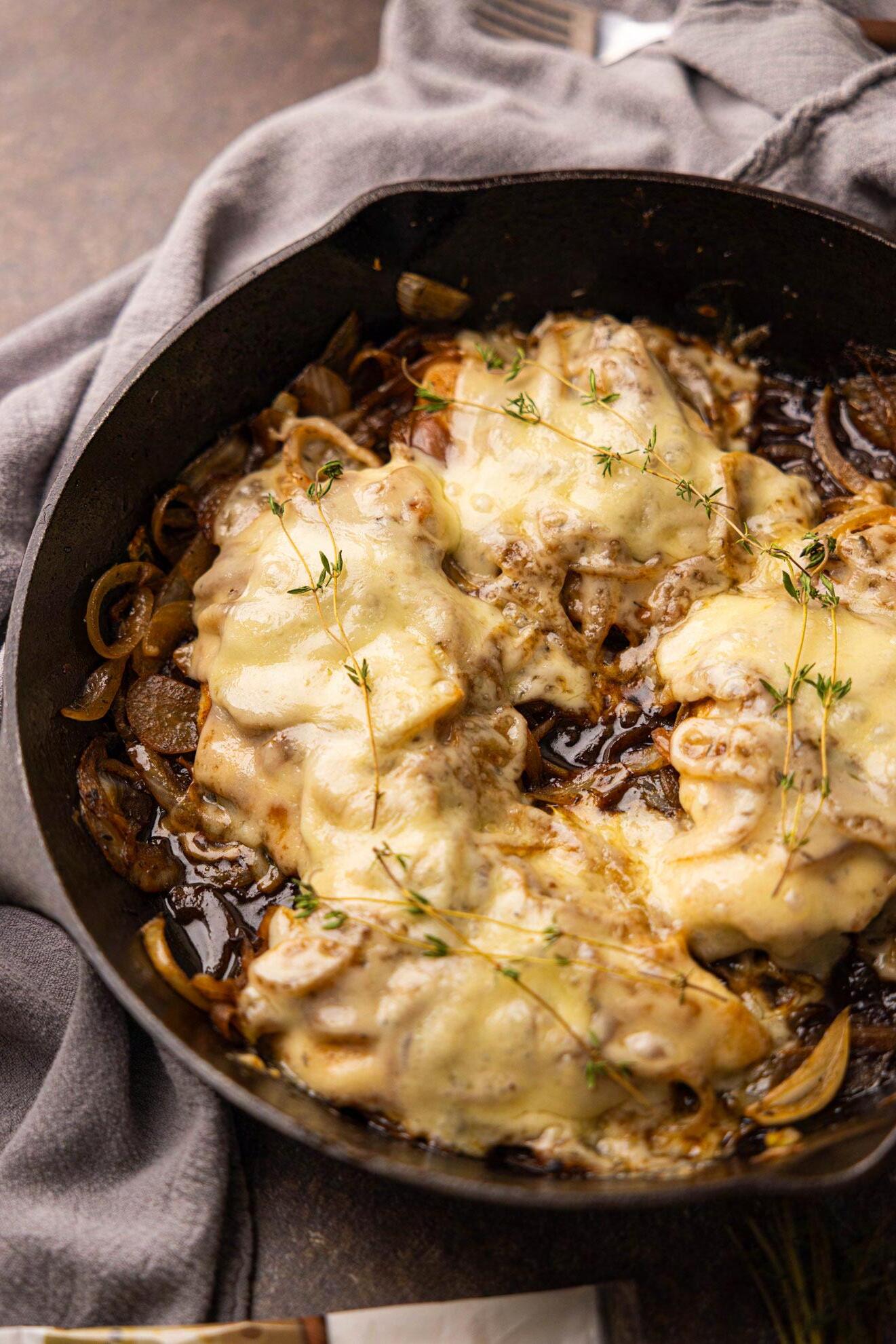 LAYER two slices of Swiss cheese over each piece of chicken. Transfer the skillet to the oven and broil for about 2 minutes, or until the cheese is melted.