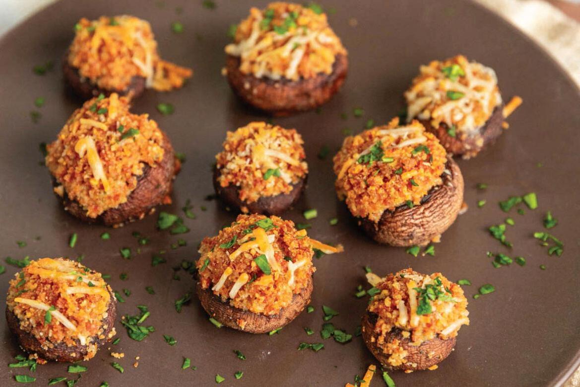 STUFF THE MUSHROOMS: Mound about 2–3 tablespoons of filling into each mushroom cap, pressing gently so the filling stays in place. Press a pinch of shredded Parmesan on top of each stuffed mushroom.