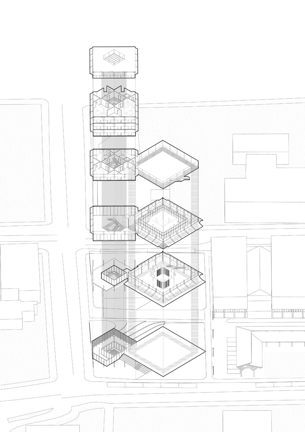 It envisions a decentralized design featuring an archive, community center, court, and flea market, serving as metaphors for historical events. By accentuating the surroundings through these fragmented structures, the design guides—or intentionally does not guide—human activities, creating spaces that offer greater freedom and encourage diverse interactions between people and their environment.