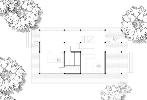 The elevated ground floor offers cross ventilation, ample space for activities, and a closer connection to the site. The open-plan living areas are expertly designed with a series of columns and partitions, offering flexible movable walls and sliding doors that can be easily adapted to suit various situations. This allows the space to be customized to meet the changing needs of the occupants, creating a versatile and functional living environment.