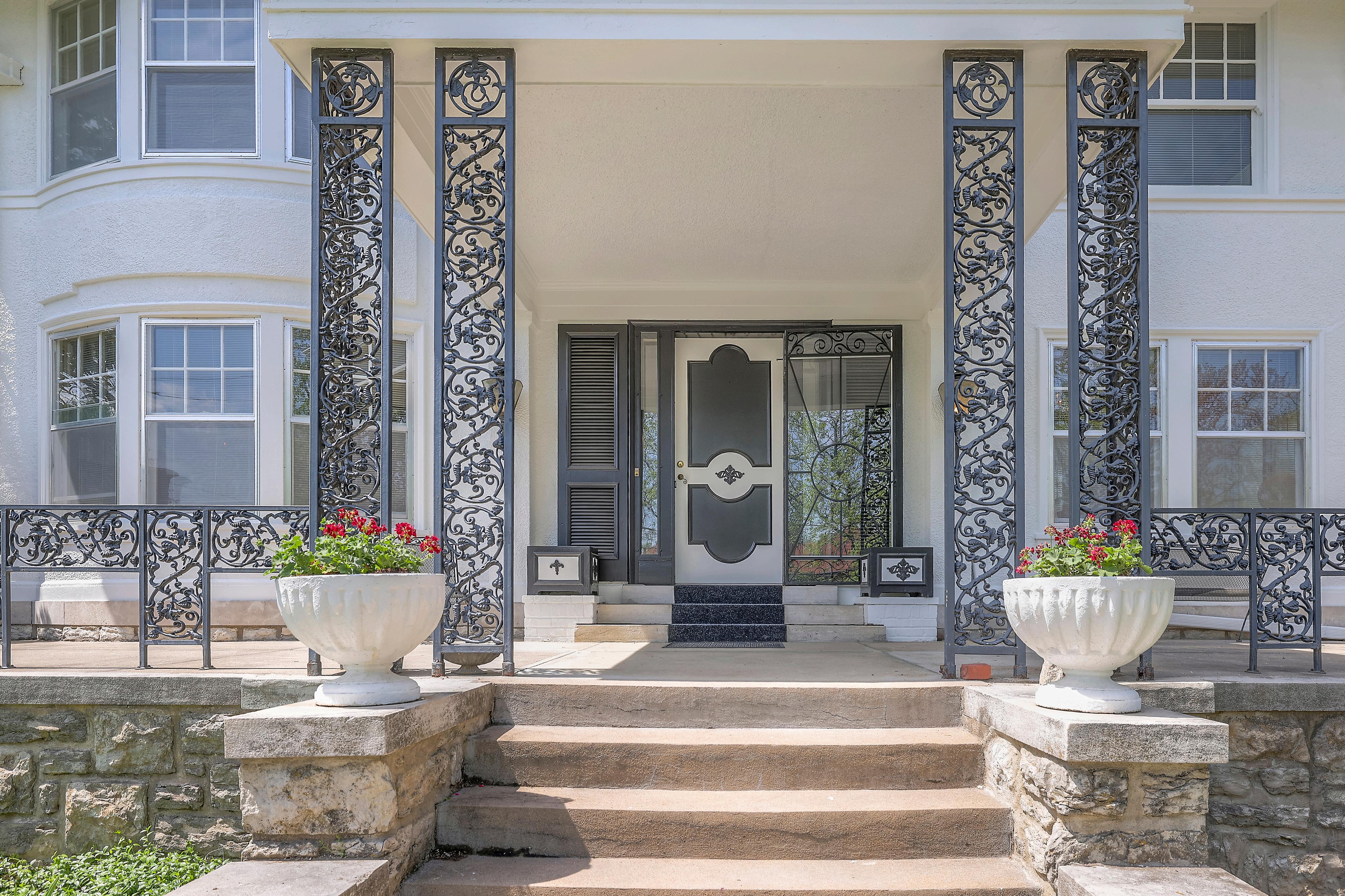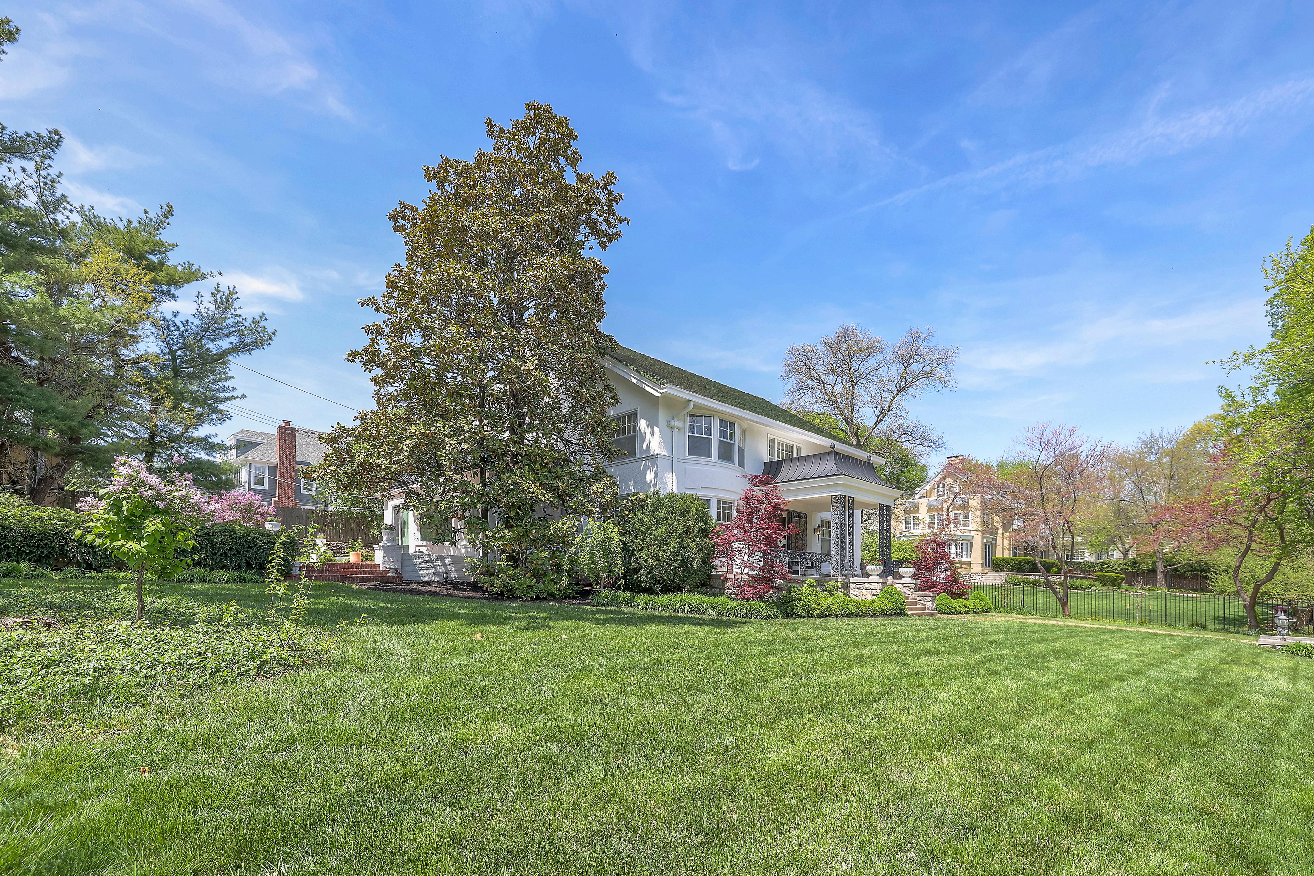 The property is enclosed by a wrought iron fence with an electronic gate for added privacy, and the beautifully landscaped yard is anchored by what is believed to be the largest Magnolia tree in Kansas City.