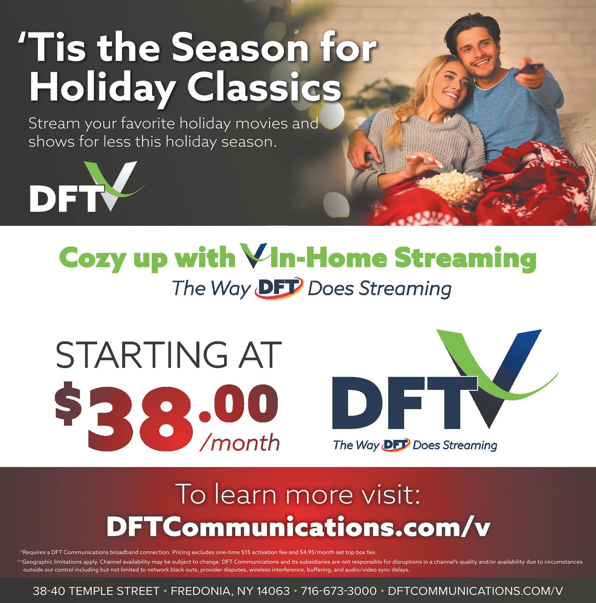 There are many ways to contact DFT Communications and its many divisions. Call 716-673-3000, 1-877-653-3100, log on to www.dftcommunica tions.com or follow us on Face book, Twitter and Instagram.