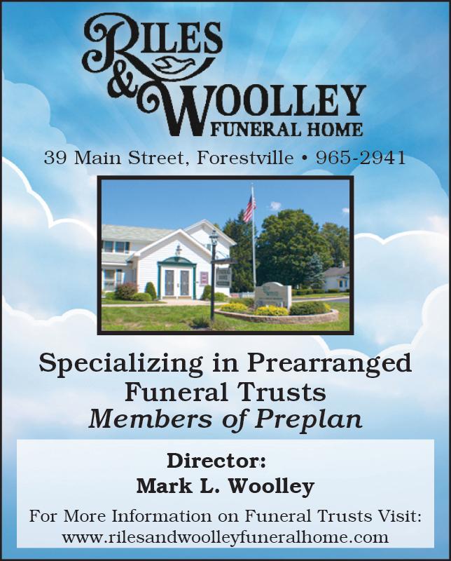 Riles & Woolley Funeral Home is located at 39 Main Street, Forestville, NY and serves the following communi ties: Forestville, Sheridan, Sil ver Creek, Irving, Hanover Cen ter, Smith Mills, Perrysburg, South Dayton, Arkwright, Fredonia & Dunkirk. Mark Woolley of Riles & Woolley Fu neral Home are both licensed to practice in New York State & Pennsylvania and is also a member of the Chautauqua County Funeral Directors Asso ciation, the New York State Fu neral Directors Association and the National Funeral Directors