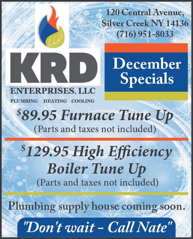 5 DECEMBER 9, 2022 O’MALIA’S LIQUOR STORE At The D&F Plaza, Dunkirk, NY 366-3980 Stock Up Today HOLIDAY GIFT SETS Don’t Let the Grinch Steal Your Holiday Spirit Largest Selection of Wine & Spirits!! Hurry In Won’t Last Long In the Spirit of Celebration Shop Our Wide Selection of Wine & Spirits MATT’S NEWS 93 E. Third St., Dunkirk 366-4909 Stocking Stuffers NYS Lottery Scratch-Offs Give them a chance to win big! 716-672-4050 T op Soil, Mulch, Stone Stump Grinding Excavation Drainage Land Grading Land Clearing Heavy and Light Brush Chopping Hydro Seeding Landscaping Ponds Driveways Site Work Demolition Beach Clean Up Erosion Control Surge RockInstallation Grape V ineyard Removal Fully Insured Black Top Millings Available for Pick-up, Delivery, Installed Commercial & Residential CLEANING, SERVICE AND INSTALLATION FURNACES, BOILERS, AIR CONDITIONERS, HOT WATER TANKS, DUCT WORK, SPLIT SYSTEM, AND GAS LINES Services: OIL, PROPANE AND NATURAL GAS 716-296-1022 www.dmheatingcooling.com 534 Maple Ave. Cherry Creek, NY 14723 Bake up a sweet holiday treat