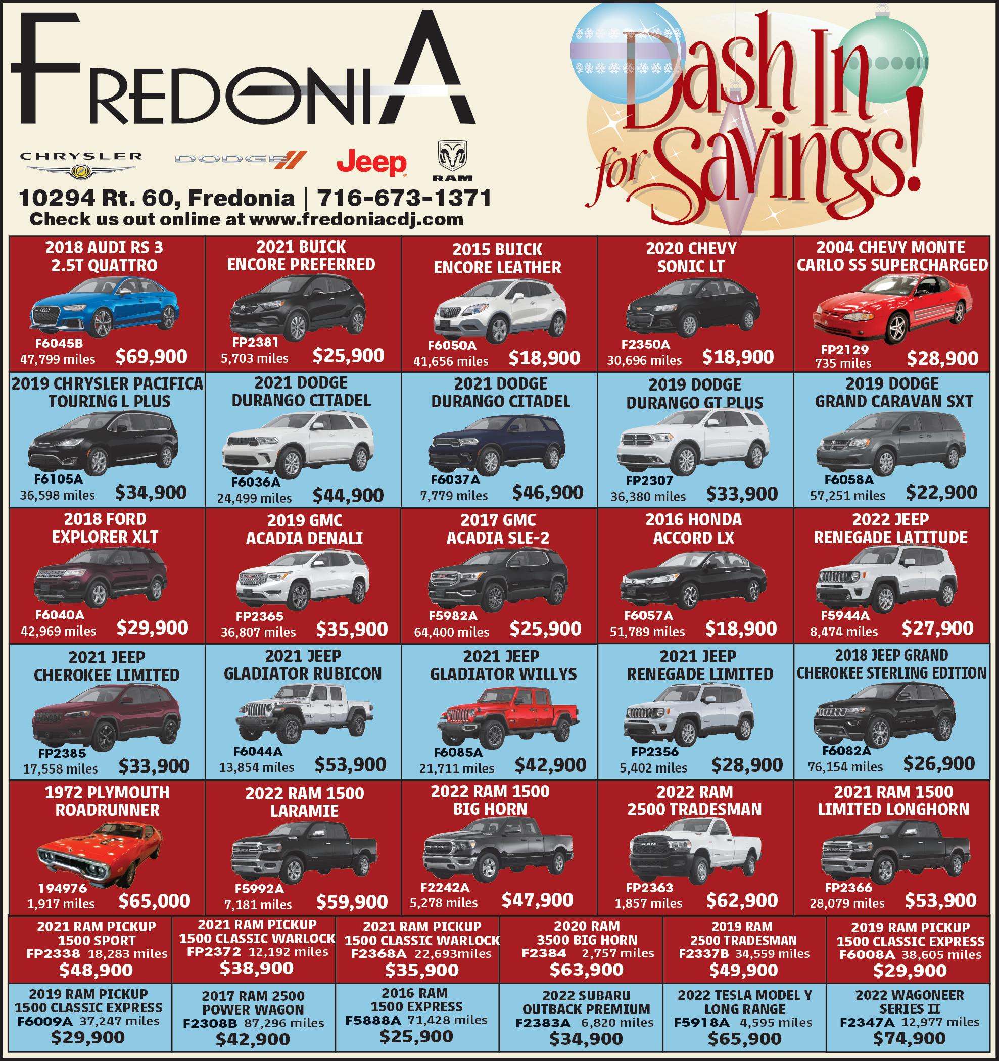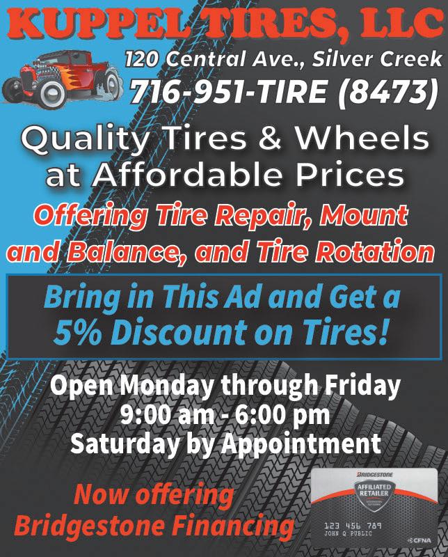 • NYS Inspections • Astro Lite Batteries (5 Year Warranty) • Complete Brake & Exhaust Service • Lawnmower, Wheelbarrow & Lawn Tractor Tires B&S DISCOUNT TIRES LOCALLY OWNED & OPERATED DRIVE WITH CONFIDENCE ALL WINTER One Temple Square Fredonia, NY, 14063 716-827-0906 TTY Relay: 1-800-662-1220 Call Today for More Information SECURITY ON SITE Available Immediately for person’s disabled and/or aged 62 years or older *Applicant Must Meet Income Level Standards ONE TEMPLE SQUARE APARTMENTS www.onetemplesquare.com