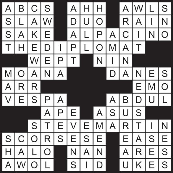 15. Rice wine 16. “Hunters” star 18. Keri Russell series 20. Cried 21. Trent Reznor’s band, for short 22. Polynesian Disney heroine 24. Copenhageners