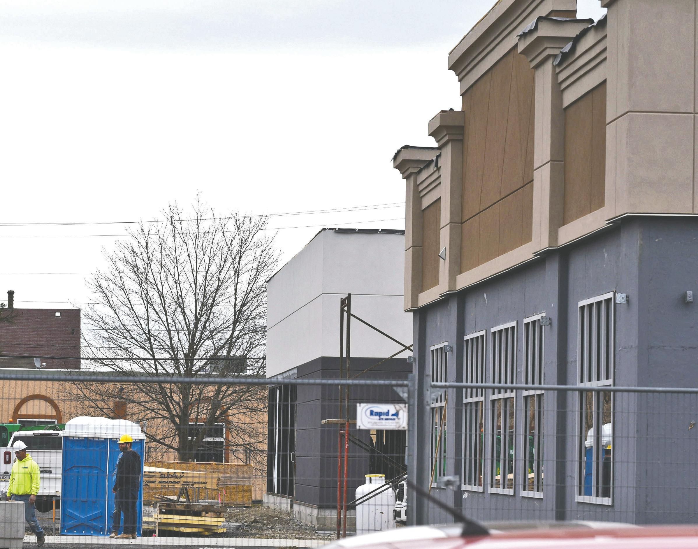 Workers build the future Chipotle restaurant (left) and WellNow Urgent Care in the West End.