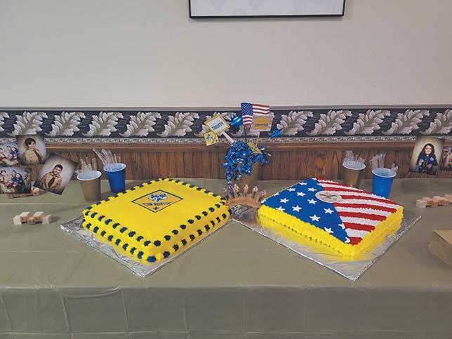 As the Cubs crossed the bridge with their parents walking alongside them, Scouts from the Troop waited at the other end to welcome them into their ranks. Each slat of the bridge bears one of the twelve points of the Scout law; a Scout is trustworthy, loyal, helpful, friendly, courteous, kind, obedient, cheerful, thrifty, brave, clean, and reverent. The Cubs’ parents were each presented with the Arrow of Light pin, recognizing that parents work alongside their children throughout their Cub Scout journey to achieve goals and progress through the ranks. Following the ceremony, everyone celebrated with a beautiful custom cake made by Holly Field that featured a miniature bridge with each of the Cubs’ photos standing on it, joining two cakes, one displaying the Cub Scouts logo, and the other with the BSA logo.
