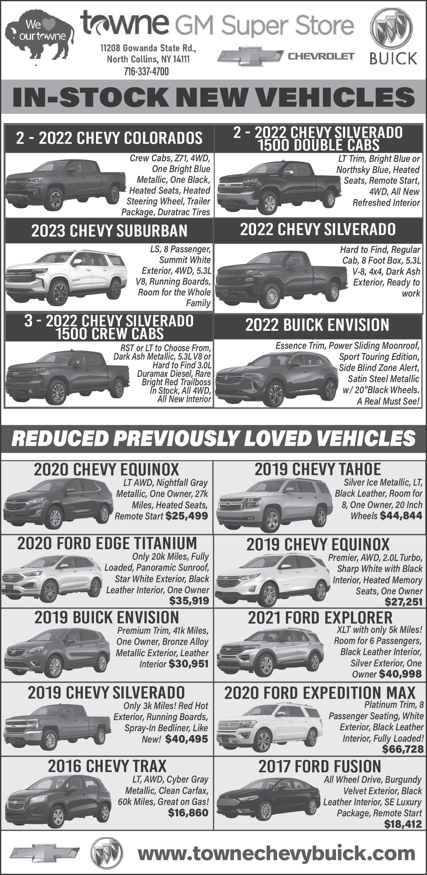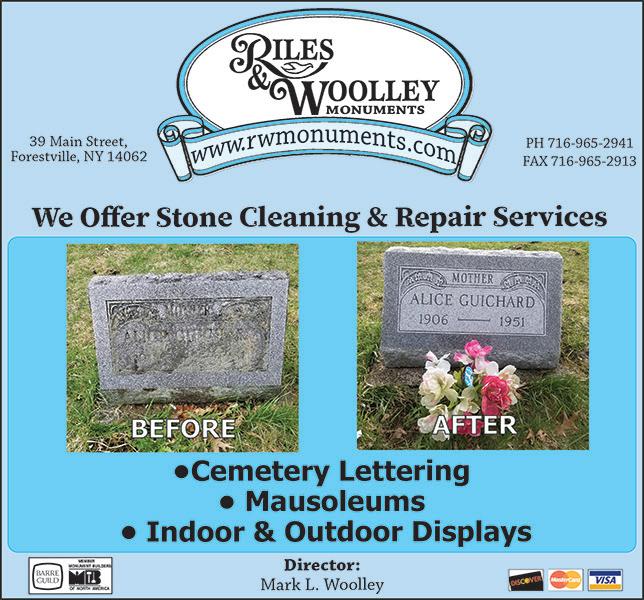 ERIE CATTARAUGUS CHAUTAUQUA COUNTY Mail coloring page and completed entry form to: Fredonia Penny Saver 7 Center Street Fredonia, NY 14063 Child’s Name: Child’s Age: Parent’s Name: Home Address: City: State: Zip: Parent’s Contact Phone: Parent’s Email: entry form Contest open to children ages 4-9. Two entries will be selected to win. No photocopy entries will be accepted. Contest entries may be displayed or published in print and online by this newspaper. Children of newspaper and sponsor employees are not eligible to win. Decision of judges is final. Winners’ parents will be notified by phone and/or email. All entries must be received by October 26, 2022 K&L CONCRETE & MASONRY STAMPED CONCRETE All Types and Colors of Stamped Work Also Driveways, Sidewalks, Patios, Cellar Floors SCHRADER-PCHELKA HOME & LAWN CALL 716-785-4598 • Home repair • Remodeling • Decks/Porches • Pole Barns • Roof Repair • Home/Garage Additions • Lawncare • Fencing 716-785-4598 FREE ESTIMATES 25 YEARS EXPERIENCE Rt. 62, North Collins 337-4700 www.townechevybuick.com 39 Main Street, Forestville • 716-965-2941 For More Information on Funeral Trusts Visit: www.rilesandwoolleyfuneralhome.com Specializing in Prearranged Funeral Trusts Members of Preplan Director: Mark L. Woolley 213 Central Avenue, Silver Creek, NY 14136 716-934-4338 Hair Salon & Spa Facials • Manicures Pedicures • Massages Full Service Salon Family Hair Care We Now O er Bellami Hair Extensions!! www silvercreekopticalny com 41 Main St Silver Creek, NY 14136 716-934-3030 New Patients Welcome Accepting Most Insurances Hours: Mon 9am-5pm Tues & Thur 9am-7pm Wed. 9am-1pm; Friday 9am-3pm Tuesday - Saturday 7AM - 3PM Sunday 7AM - 1 PM Locally Op Locally Owned & Op ated f OvLocally Owned & Op ated f Ov