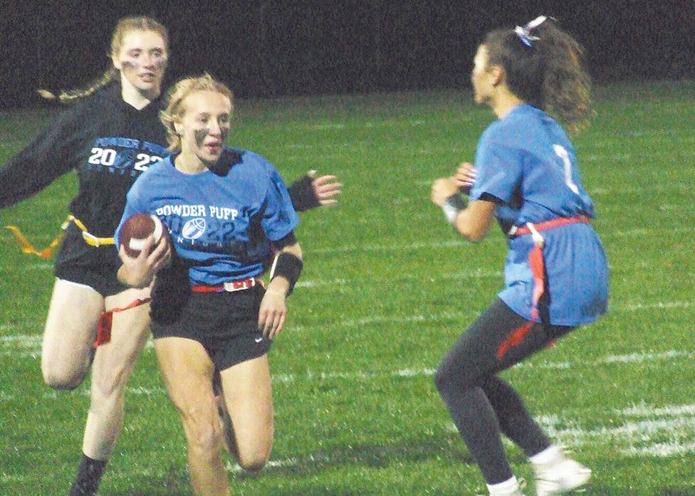 Following the parade was the Powderpuff flag football game between the junior and the senior girls. In a game played be tween the twenties on Hil lis Field, the juniors won the coin toss and had the opening possession. It took them just four plays to score the first touchdown on a 30-yard run. The se niors came right back to tie things at 6.