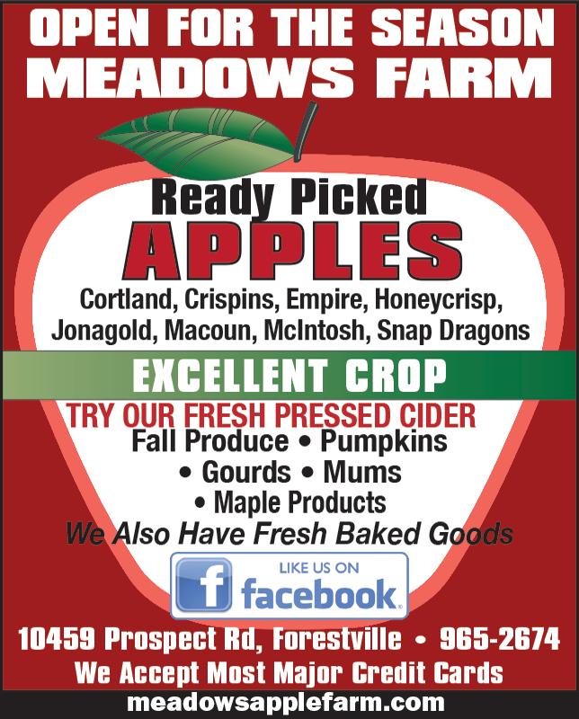 2 NOVEMBER 4, 2022ERIE CATTARAUGUS CHAUTAUQUA COUNTY COMMUNITY SOURCE Honeycrisp • Snap Dragon • Cortland McIntosh • Macoun • Empire • Ruby Frost CAVES FOOD & DELI 5 Main St., Forestville, NY 716-965-2931 Hours: Weekdays 6am-10pm; Weekends 7am-10:30pm Game Day Sampler Special Includes: 4 Tenders, 4 Pizza Logs, 8 Mini Tacos, French Fries, Broccoli Bites, Jack Bites $24.99 2 Large (1 Topping) Pizzas $32.99 Also Now Serving Potato Skins 4 for $6.99 Commercial & Residential CLEANING, SERVICE AND INSTALLATION FURNACES, BOILERS, AIR CONDITIONERS, HOT WATER TANKS, DUCT WORK, SPLIT SYSTEM, AND GAS LINES Services: OIL, PROPANE AND NATURAL GAS 716-296-1022 www.dmheatingcooling.com 534 Maple Ave. Cherry Creek, NY 14723