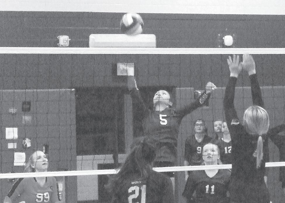 Gowanda’s Chloe Luther (5) goes up for the ball in an Oct. 27 playoff game against Clymer/Sherman at Gowanda.