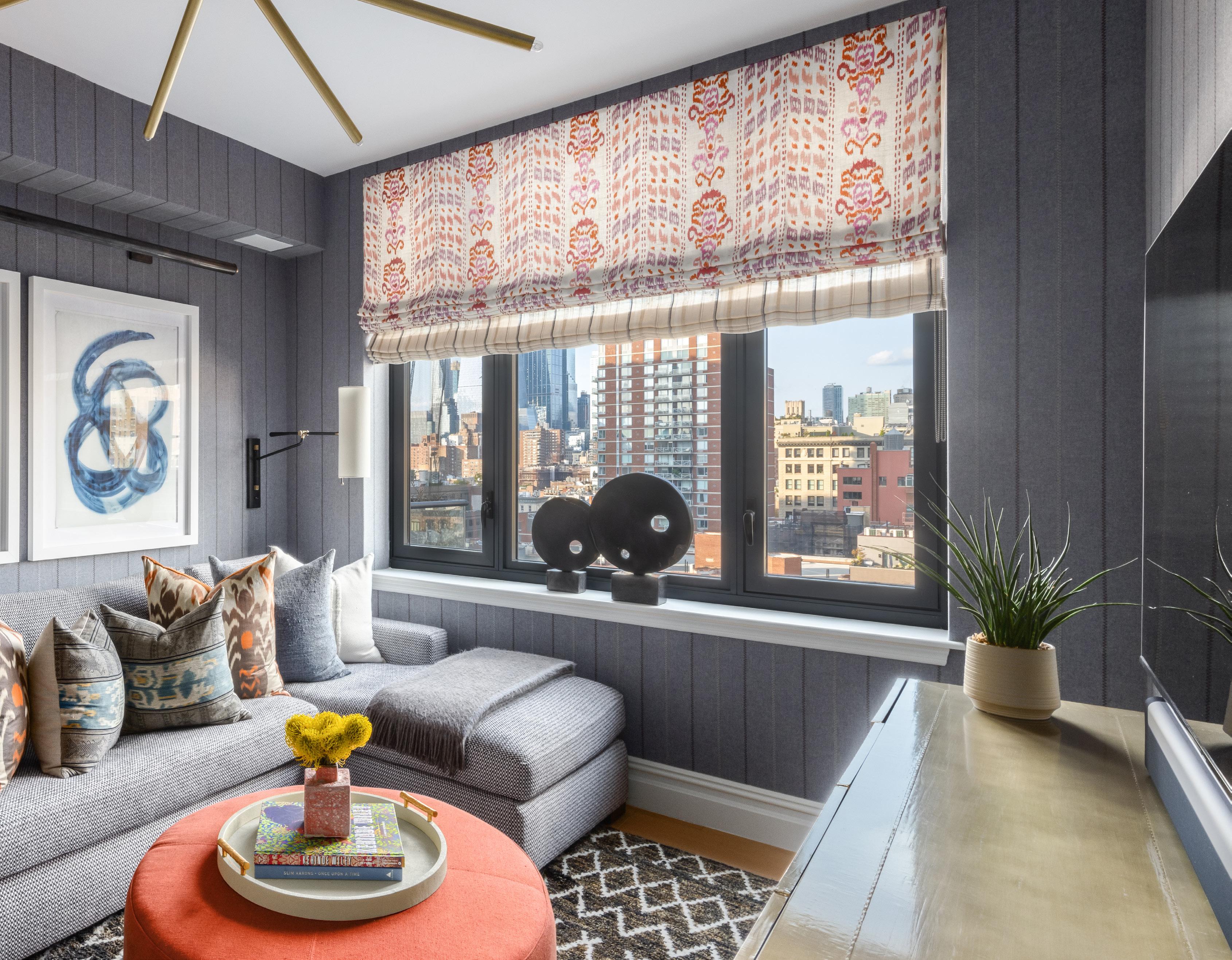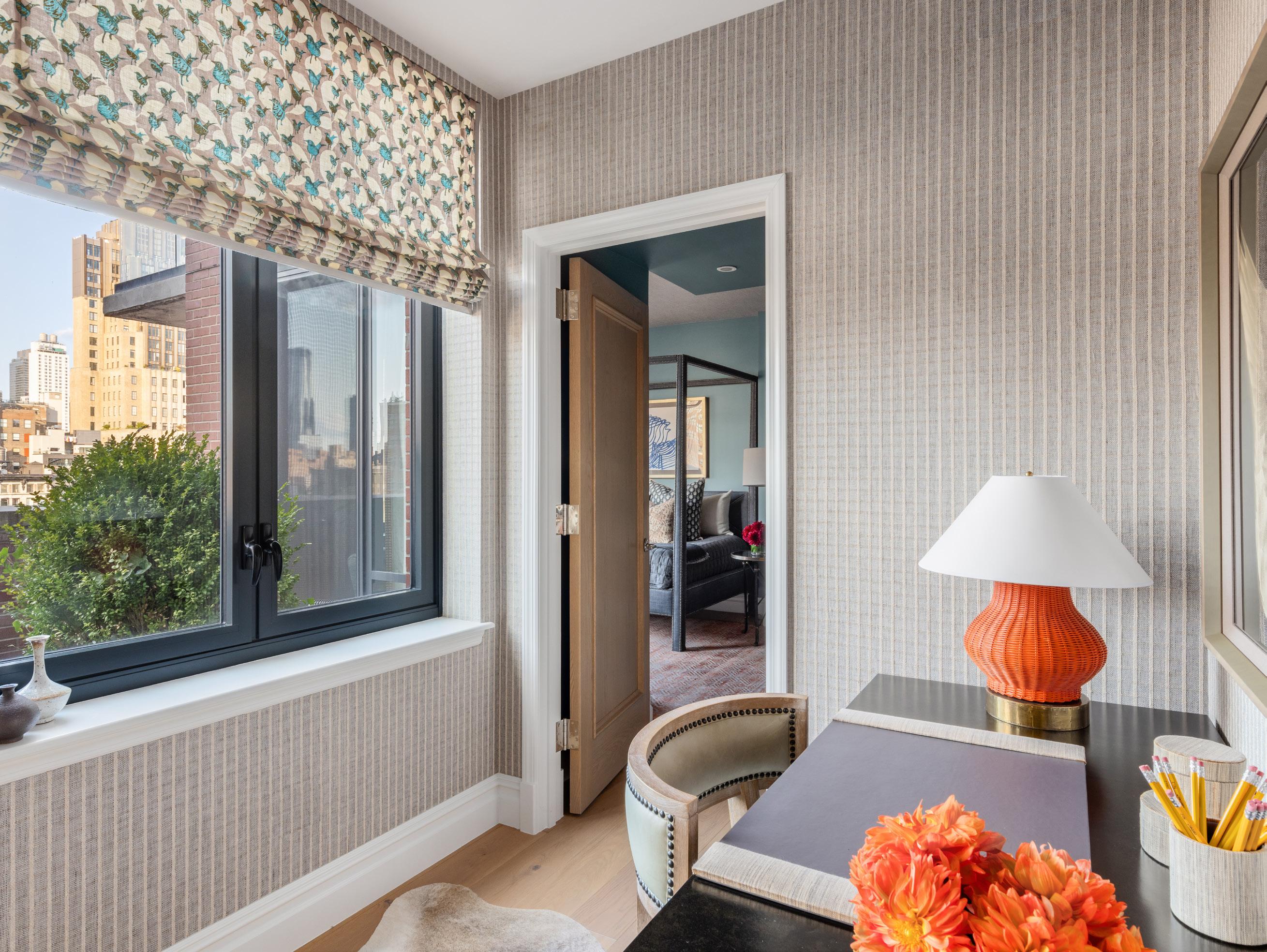 Currently being used as a media room, bedroom suite two stands out with a cozy felt wallpaper and gorgeous layered roman shades. Bedroom suite three currently functions as a guest suite with an adjacent north facing terrace, complete with wallpaper and custom roman shades and curtains. Completing the home is a windowed home office/ playroom between the two secondary bedrooms.