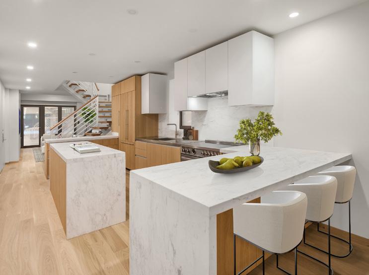 • Sleek Miele appliances, a 36” Bertazzoni induction range and hood, Artemis White marble countertops and backsplash, a dual-zone French door wine refrigerator, a Bosch drawer microwave and concealed trash an recycling bins, all surrounded by European Oak cabinetry by Alta Cucine.