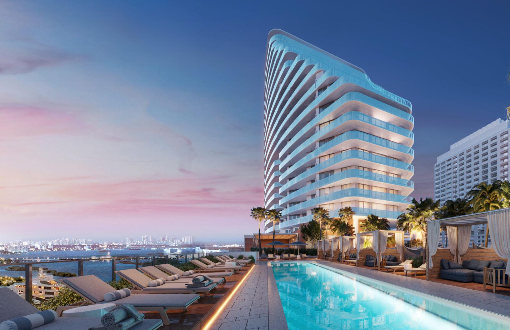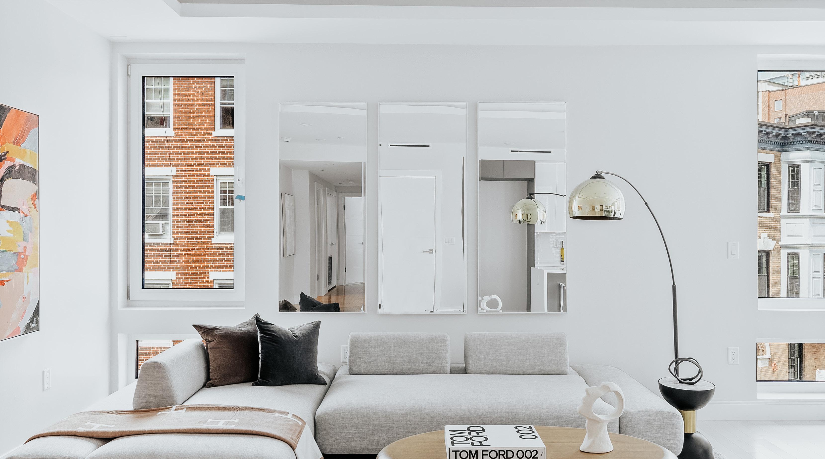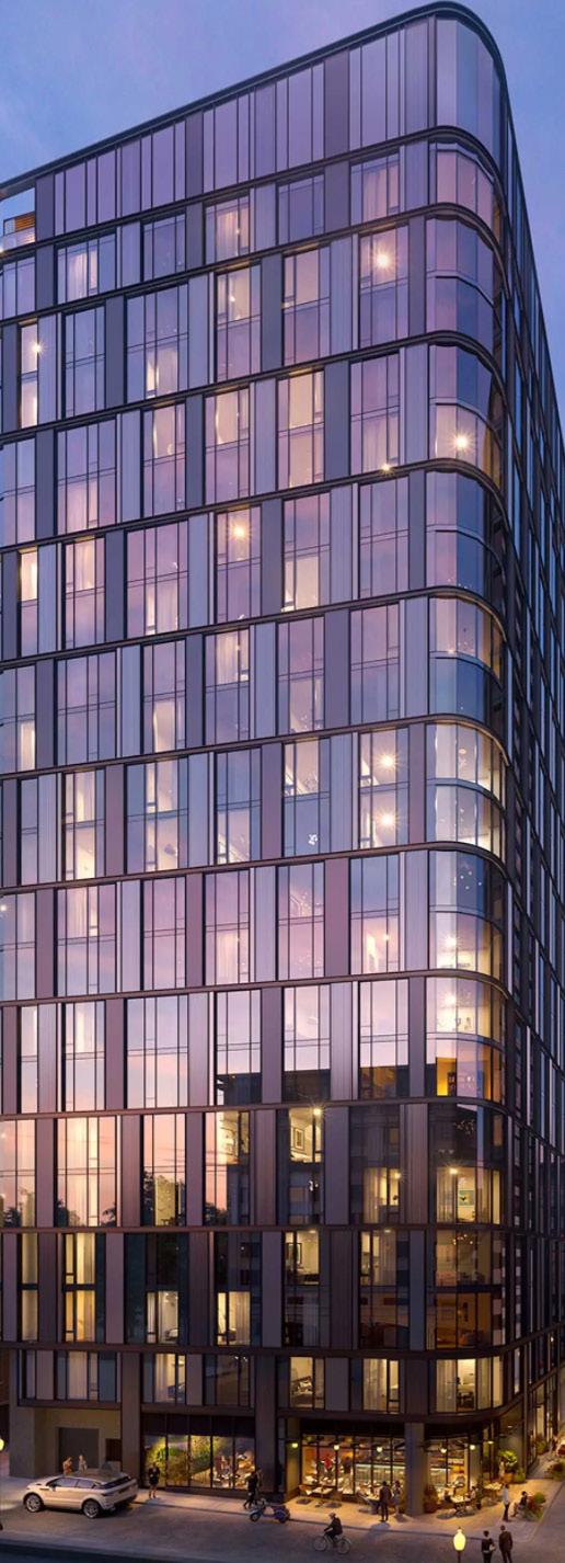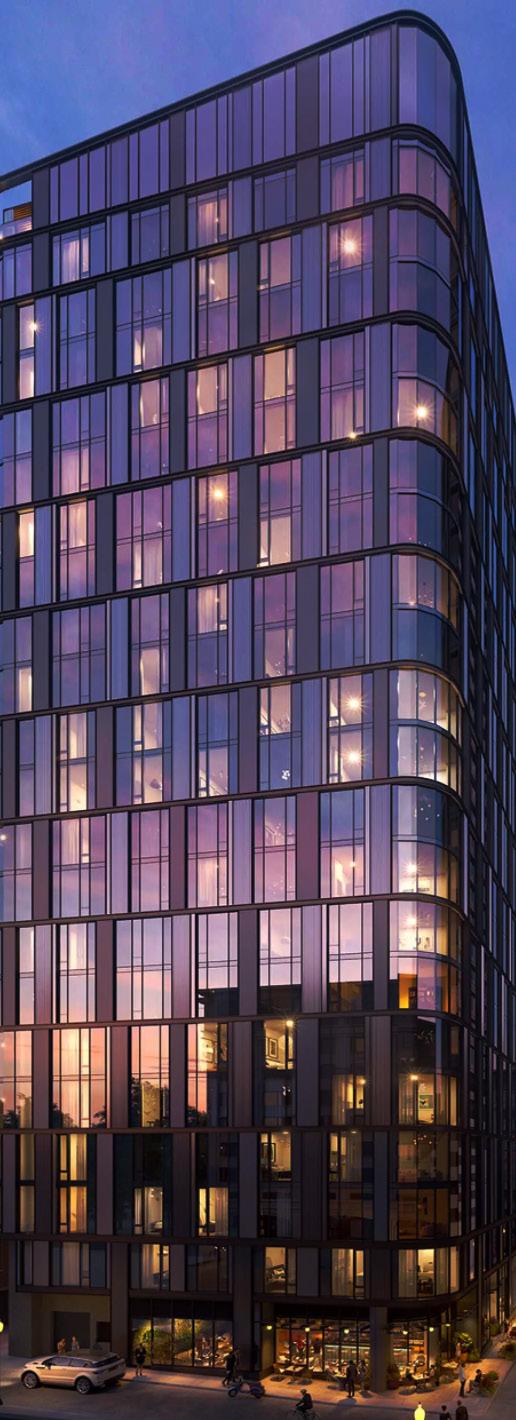 Residences feature a clean design with unexpected details such as sculptural floor-to-ceiling windows and wide-plank white oak flooring. The kitchen boasts a custom Italian marble backsplash with brass finishes and a rich color palette combining materials and textures to create a sleek, dynamic aesthetic. Each layout is efficiently designed to cater to the modern city dweller and offers residents an exclusive lifestyle.