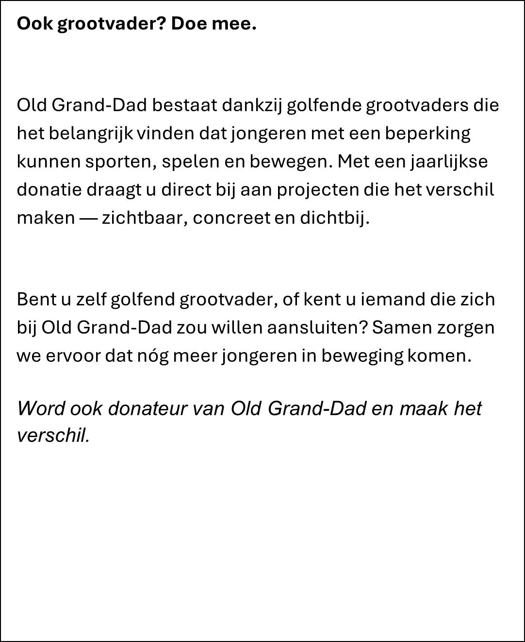 Old Grand-Dad beheert de donaties van duizenden golfende grootvaders met zorg en verantwoordelijkheid. Jaarlijks wordt een aanzienlijk deel van de inkomsten besteed aan projecten die jongeren met een beperking stimuleren om te sporten, spelen en bewegen.