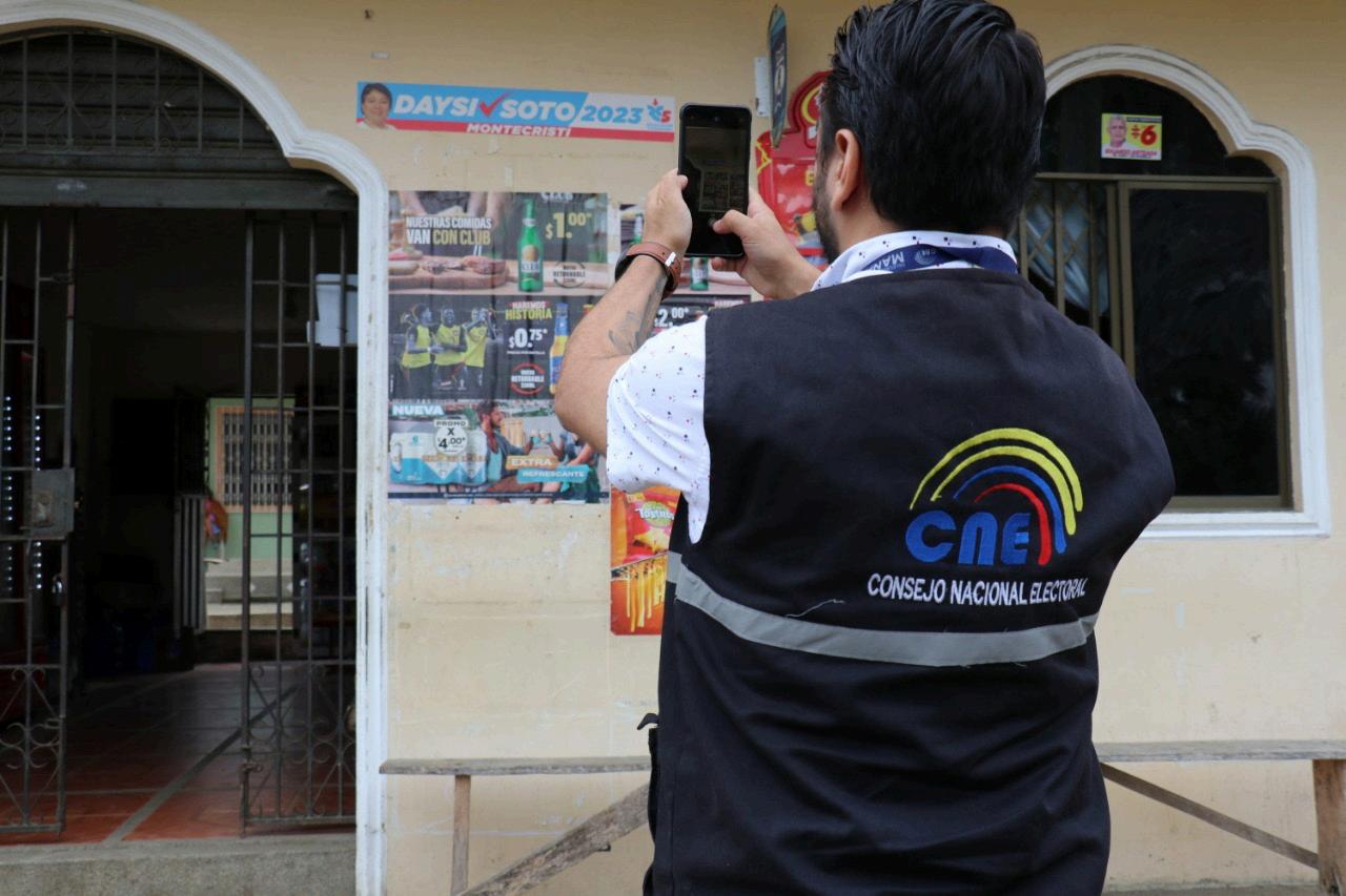 Personal de la Unidad de Fiscalización de la Delegación Provincial Electoral de Mana bí, en cumplimiento al Reglamento para el Control de Propaganda o Publicidad y Pro moción Electoral establecida en el Código de la Democracia, realiza el monitoreo de