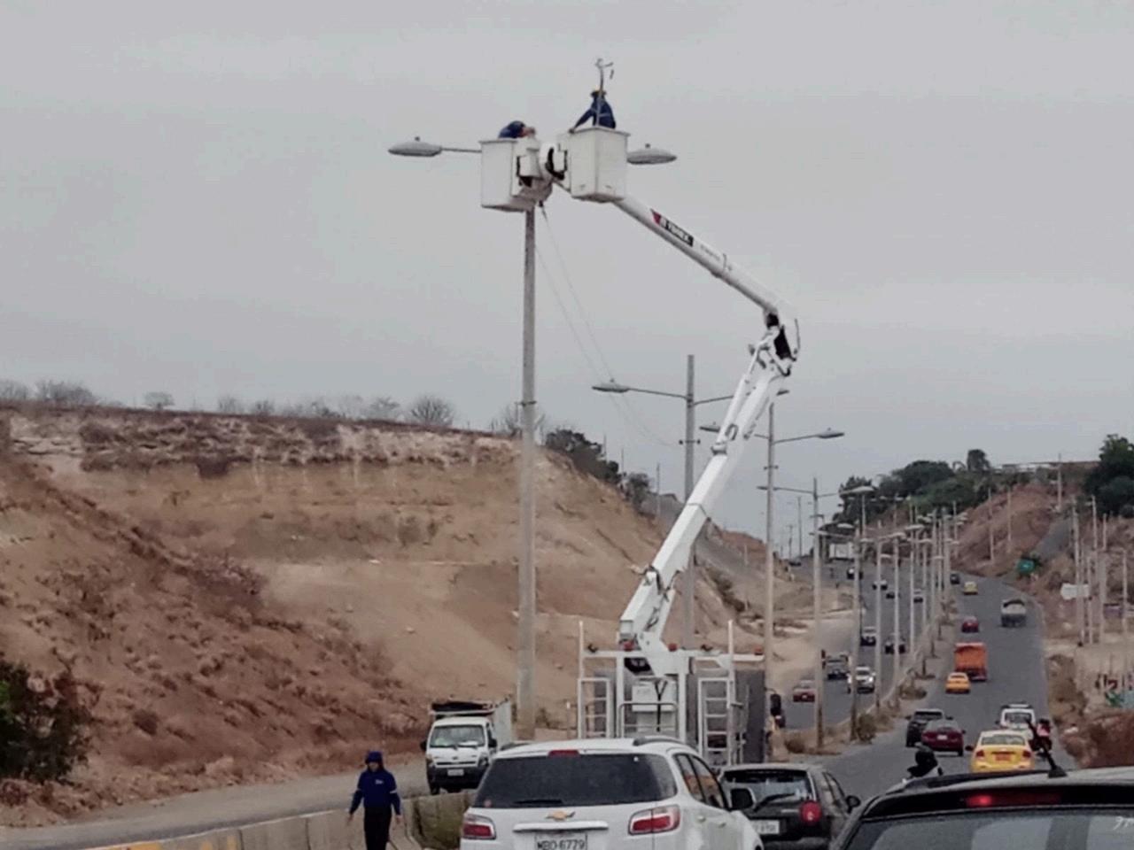 Con el propósito de contribuir a la seguridad vial, la Corporación Nacional de Electricidad Unidad de Ne gocio Manabí realiza trabajos de mantenimiento en el sistema de alumbrado público de la vía Circunvala ción del cantón Manta.