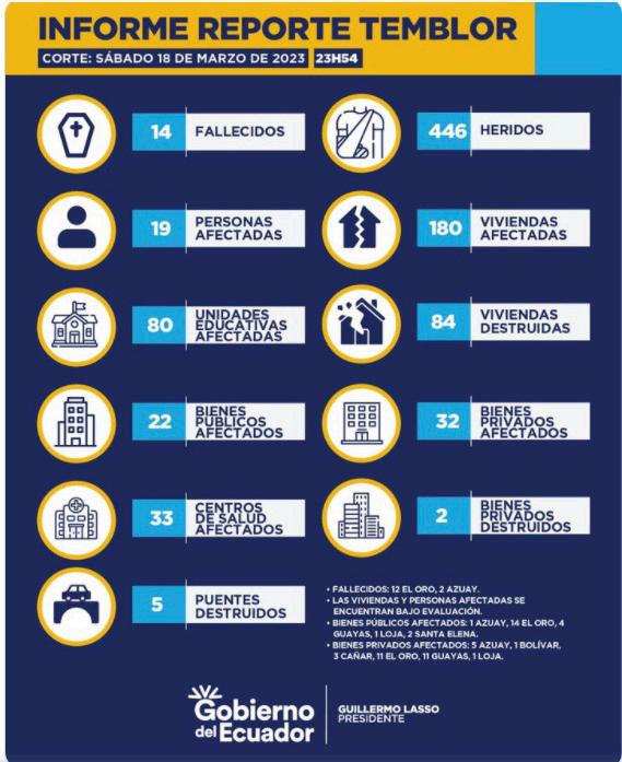 12 se registraron en El Oro y 2 en Azuay, detalla el informe. Además, hay 446 heridos y 180 viviendas afectadas.