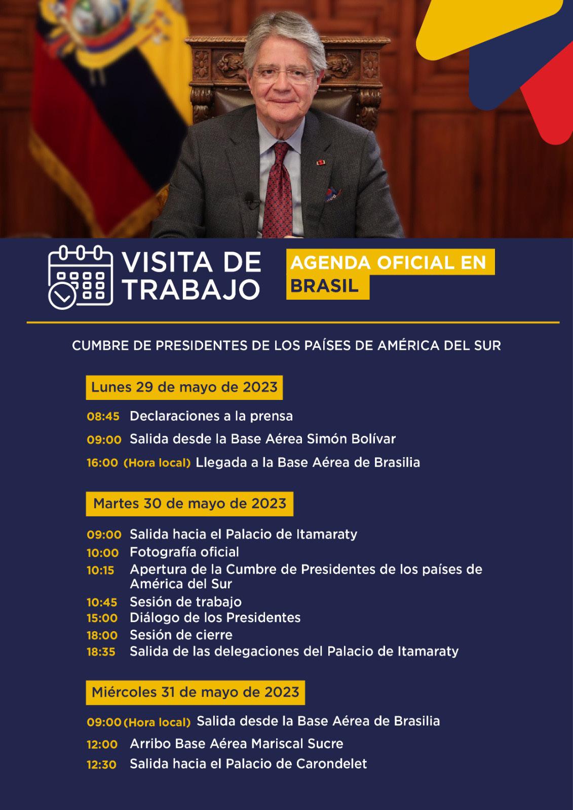El presidente de Ecuador, Guillermo Lasso, participará en la Cumbre de los Países de América del Sur, que tendrá lugar en Brasilia, confirmó este domingo la Secretaría General del Comunicación de la Presidencia de la República.